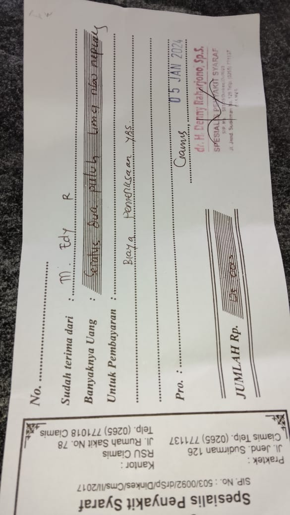 Saya Eddy Rustandi yang punya saraf kaki berat. Tanggal 2 Januari saya periksa ke dr.Deny Raharjono Sp.S, karena resep dokter sudah habis. Jadi otomatis beli obat tanpa pakai resep dokter dan sama apotek tidak diganti.
