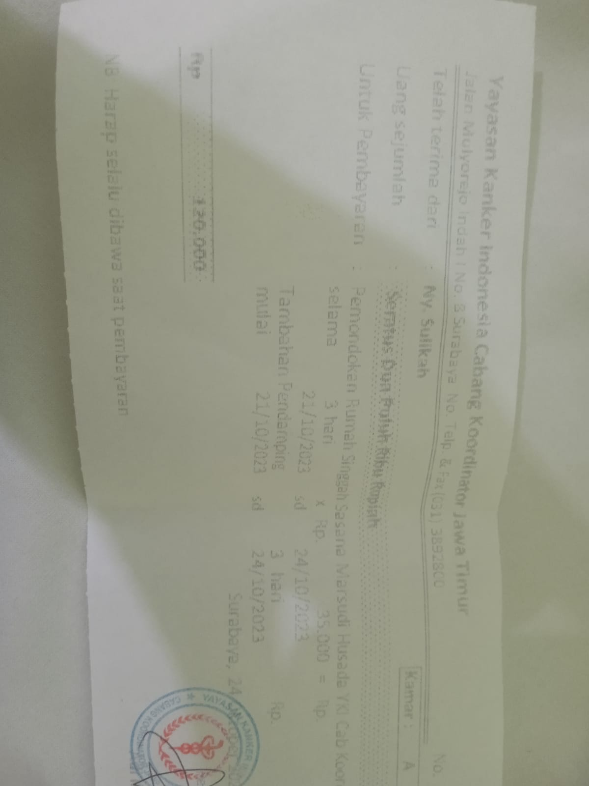 Hari ini tanggal 24 Oktober, ibuku rawat inap di RSUD Soetomo. Semoga nanti malam sudah bisa menjalani kemoterapi yang kedua kali. Oya TemanBaik, mengingat ibuku hanya tinggal sebentar di rumah singgah, jadi biayanya lebih murah dari dana yang diajukan - sehingga sisanya digunakan untuk biaya konsumsi makanan.