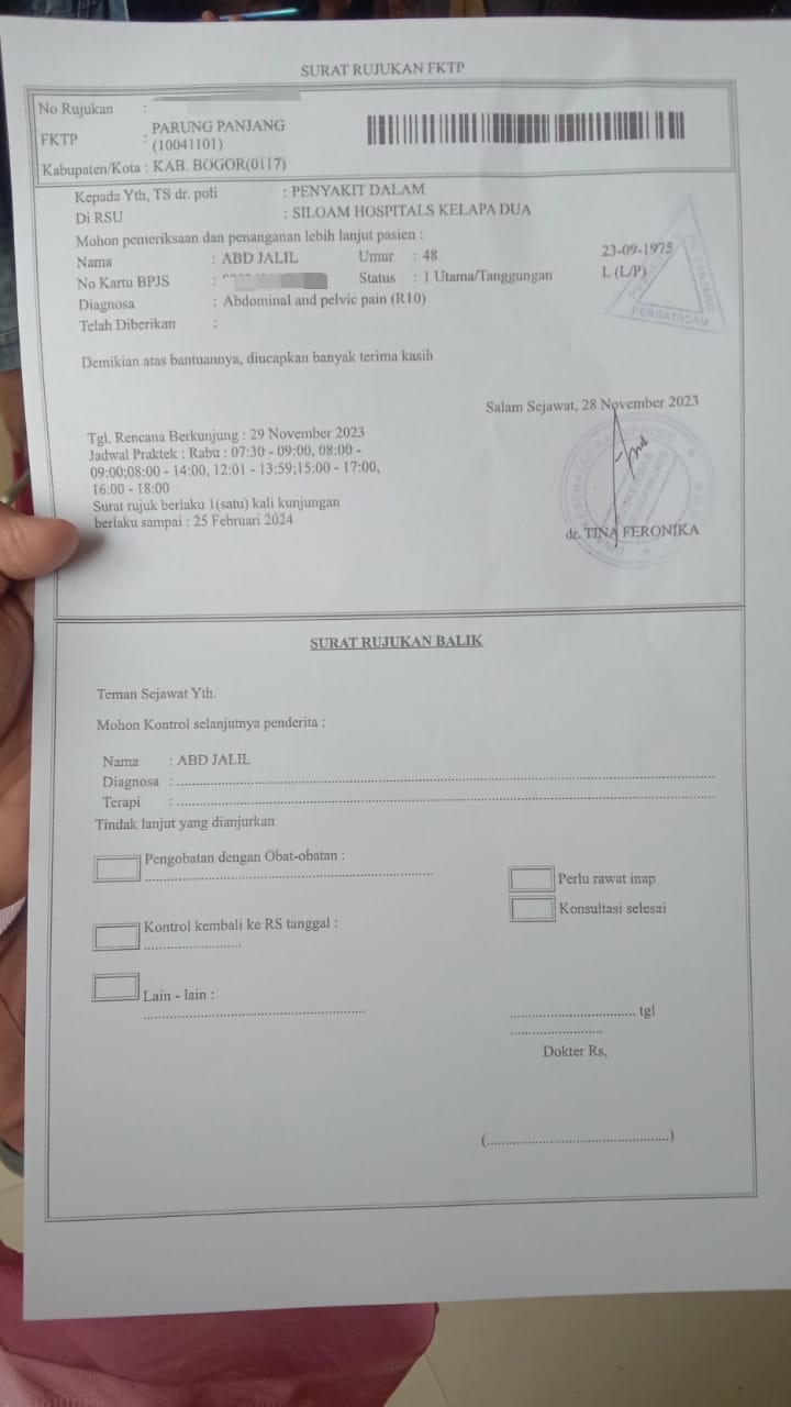 Bantuan dari #TemanBaik sudah digunakan untuk pembayaran tunggakan BPJS. Berkat kalian, aku bisa pergi berobat lagi untuk kontrol rutin kesehatan saya, dan juga melakukan pemeriksaan USG di RSU Siloam Kelapa Dua.