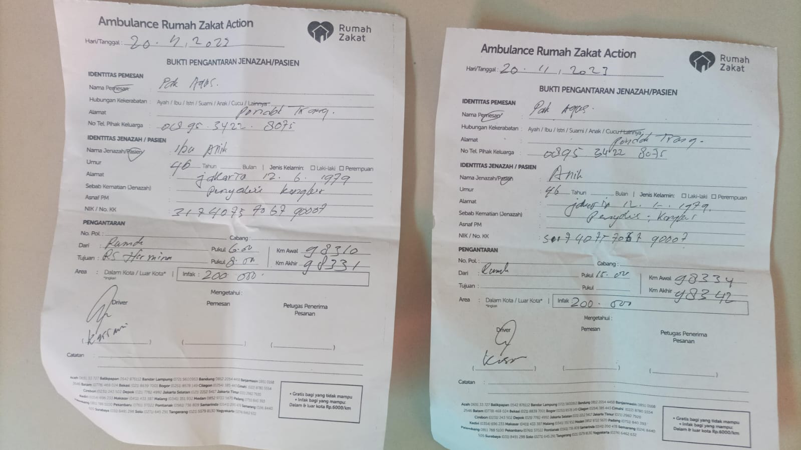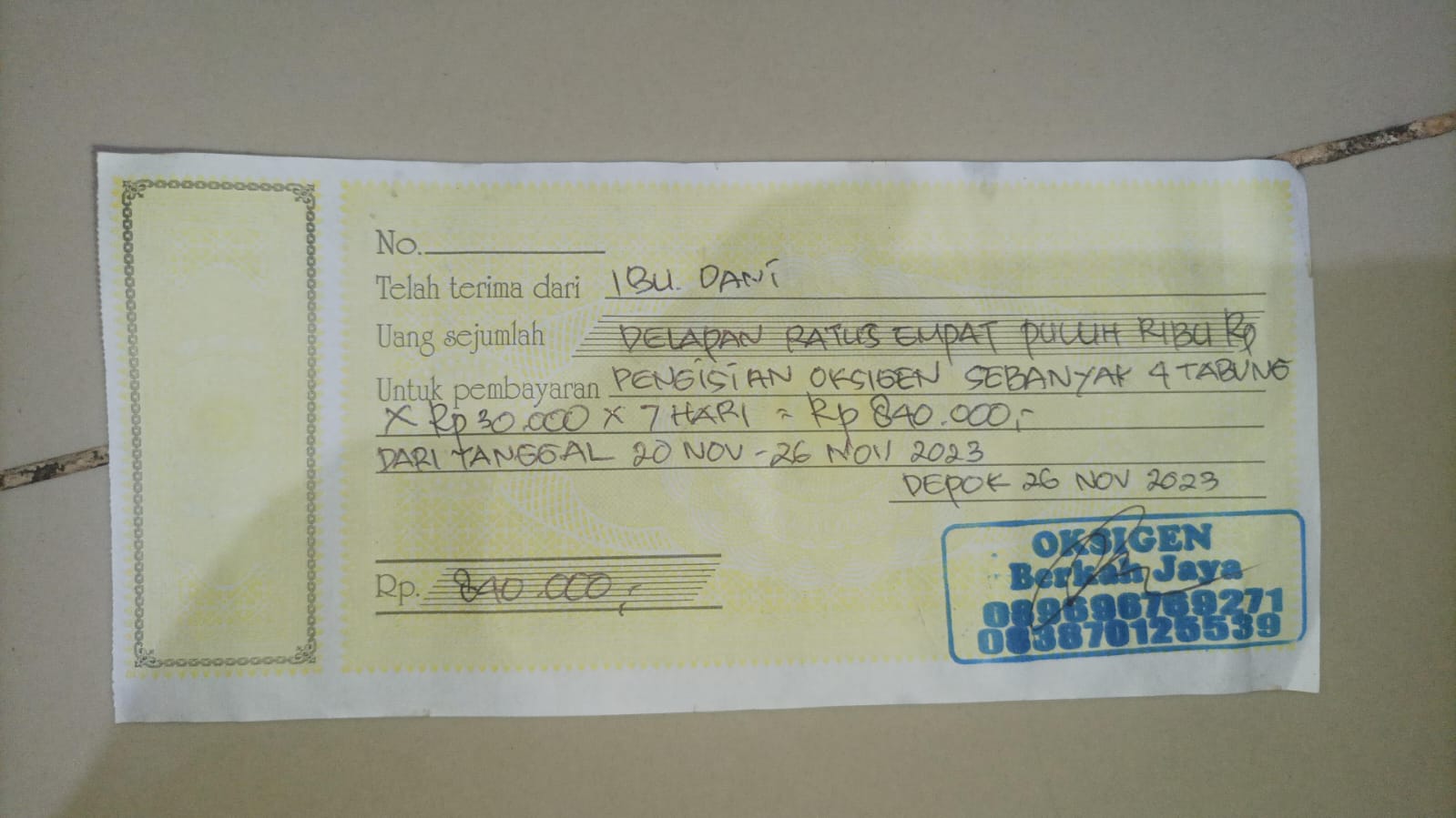 Oya bantuan dari TemanBaik sudah dipakai untuk membantu biaya isi ulang oksigen, biaya transportasi ambulance ke rumah sakit, dan perlengkapan medis
