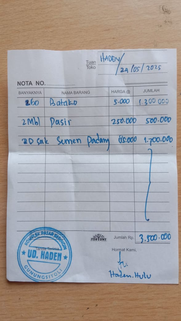 Dana digunakan untuk 1. Semen sebanyak Rp85.000 x 20 karung = Rp1.700.000 2. Pasir Rp250.000 x 2 mobil = Rp500.000 3. Batako sebanyak Rp5.000 x 260buah = Rp. 1.300.0002025-05-22 15:35:43