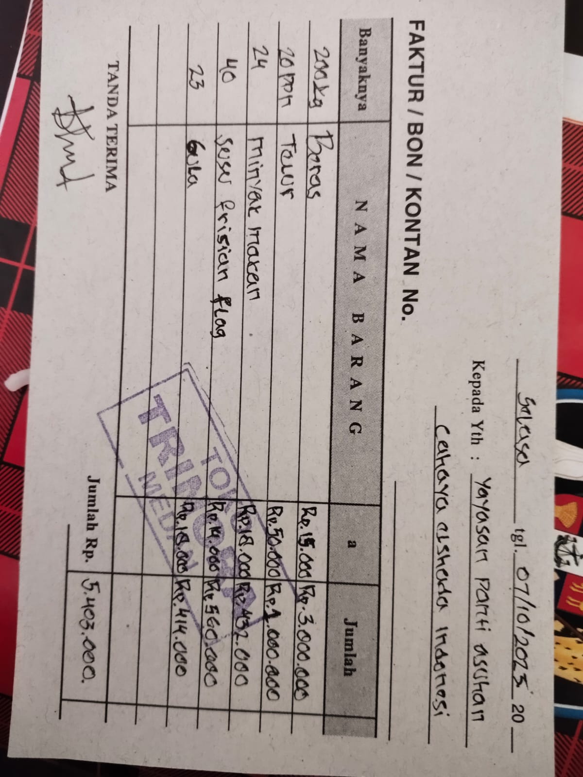 Dana digunakan untuk 1. Beras Rp15.000 x 200kg = Rp3,000,000 2, Telur Rp50.000 x 20papan = Rp 1.000.000 3. Minyak makan Rp18.000 x 24 = Rp432,000 4. Susu frisian flag Rp14.000 x 40 = Rp560,000 5. Gula Rp18,000 x 23 = Rp414.0002025-10-07 10:20:37