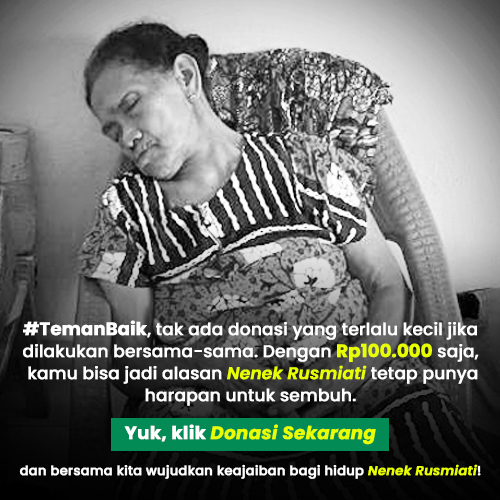 #TemanBaik, tak ada donasi yang terlalu kecil jika dilakukan bersama-sama. Dengan Rp100.000 saja, kita bisa jadi alasan Nenek Rusmiati tetap punya harapan. Yuk, klik Donasi Sekarang dan bersama kita wujudkan keajaiban bagi hidup Nenek Rusmiati!