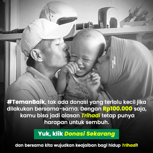 #TemanBaik, tak ada donasi yang terlalu kecil jika dilakukan bersama-sama. Dengan Rp100.000 saja, kita bisa jadi alasan Trihadi tetap punya harapan untuk sembuh. Yuk, klik Donasi Sekarang dan bersama kita wujudkan keajaiban bagi hidup Trihadi!