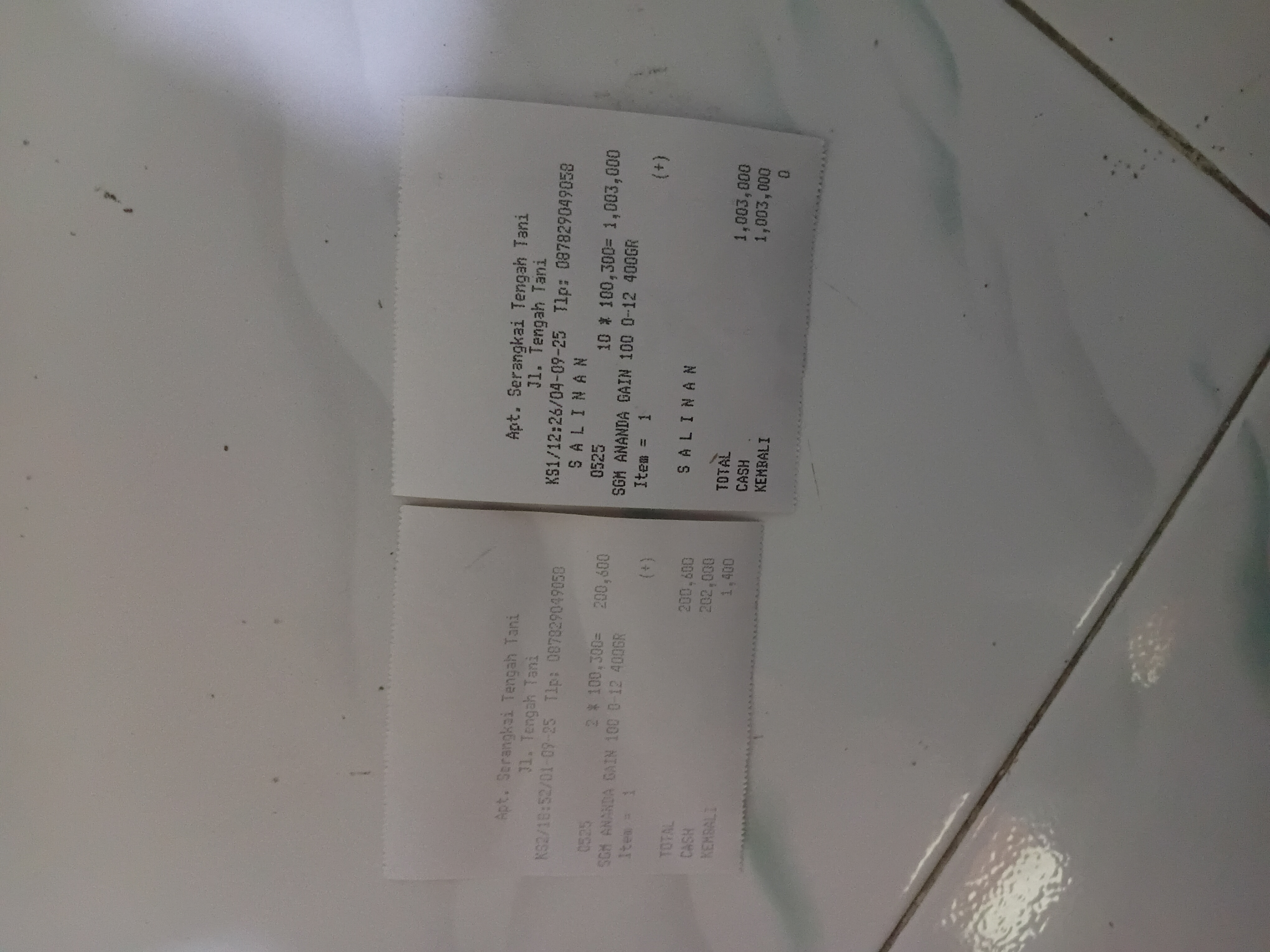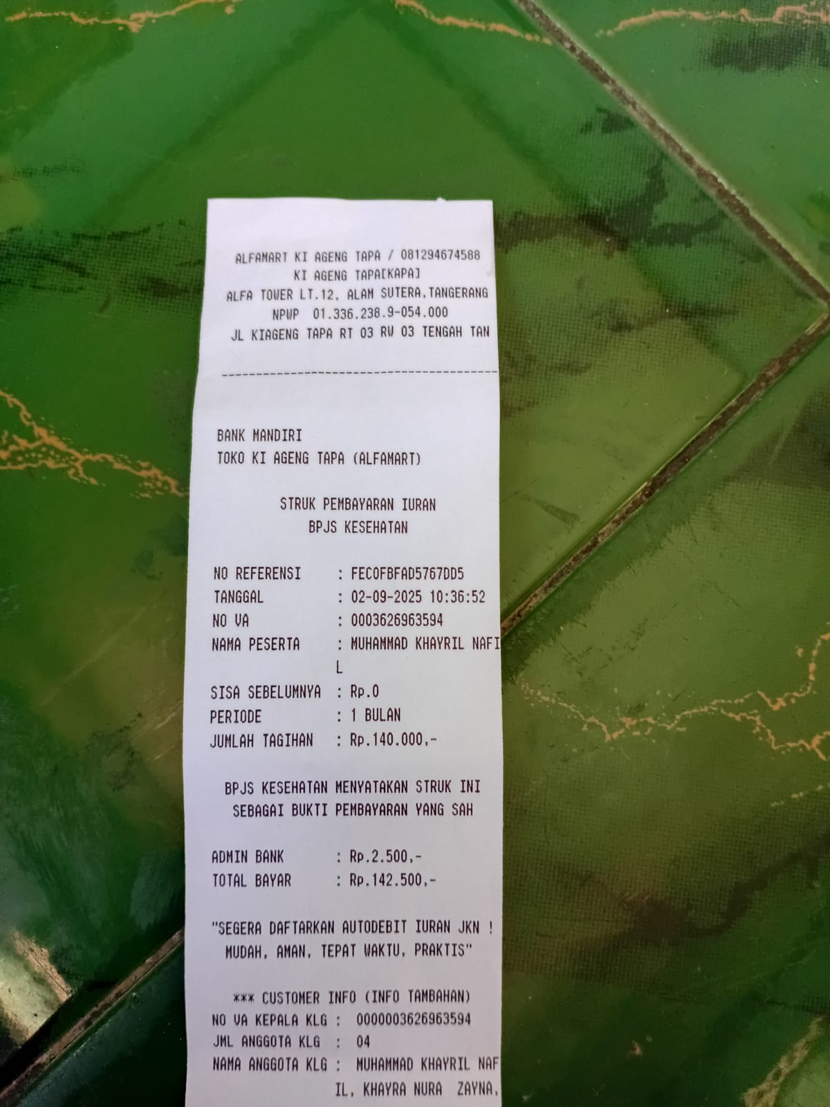 Dana digunakan untuk 1. Pembelian Susu SGM Gain 100 12 box x Rp107.000 = Rp1.284.000 2. Pembelian 6 bal Popok makuku M Rp250.000 3. Bayar BPJS Kesehatan September Rp140.000 4. Vitamin Prove D Rp240.0002025-09-02 08:42:52