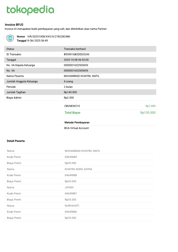 Dana digunakan untuk 1. Pembayaran BPJS November Rp140.000 2. Tabung oksigen fullset Rp830.000 3. Popok makuku Size L jumbo 2 ball Rp200.000 4. Susu SGM Optigrow 1+ 800 gram Rp170.000 x 3 = Rp510.000 5. Reimburse Tiket Kereta api jakarta - Cirebon Rp150.000 x 2 orang = Rp300.0002025-11-06 10:28:26