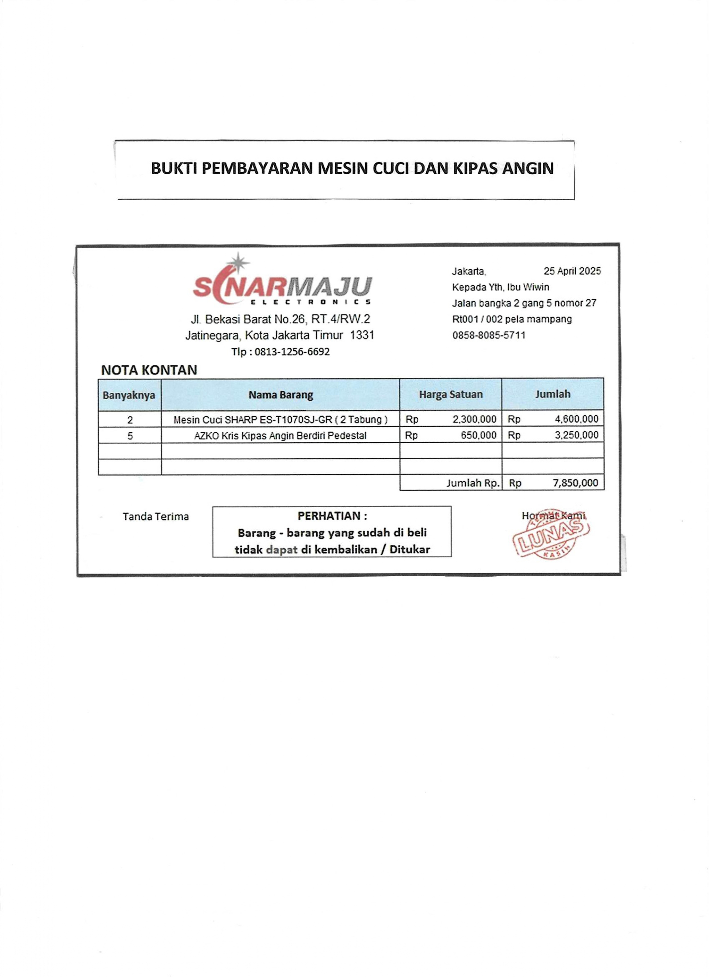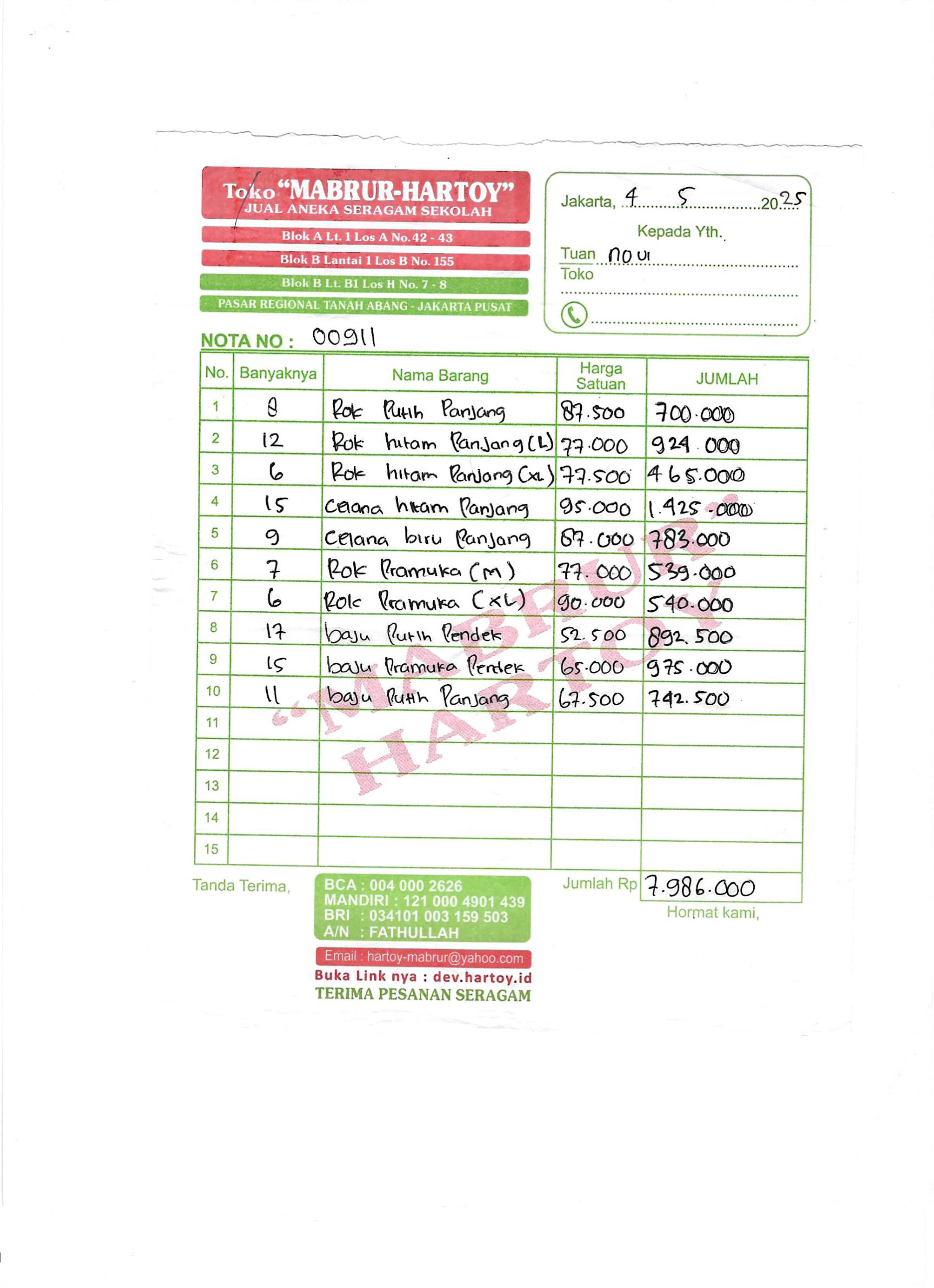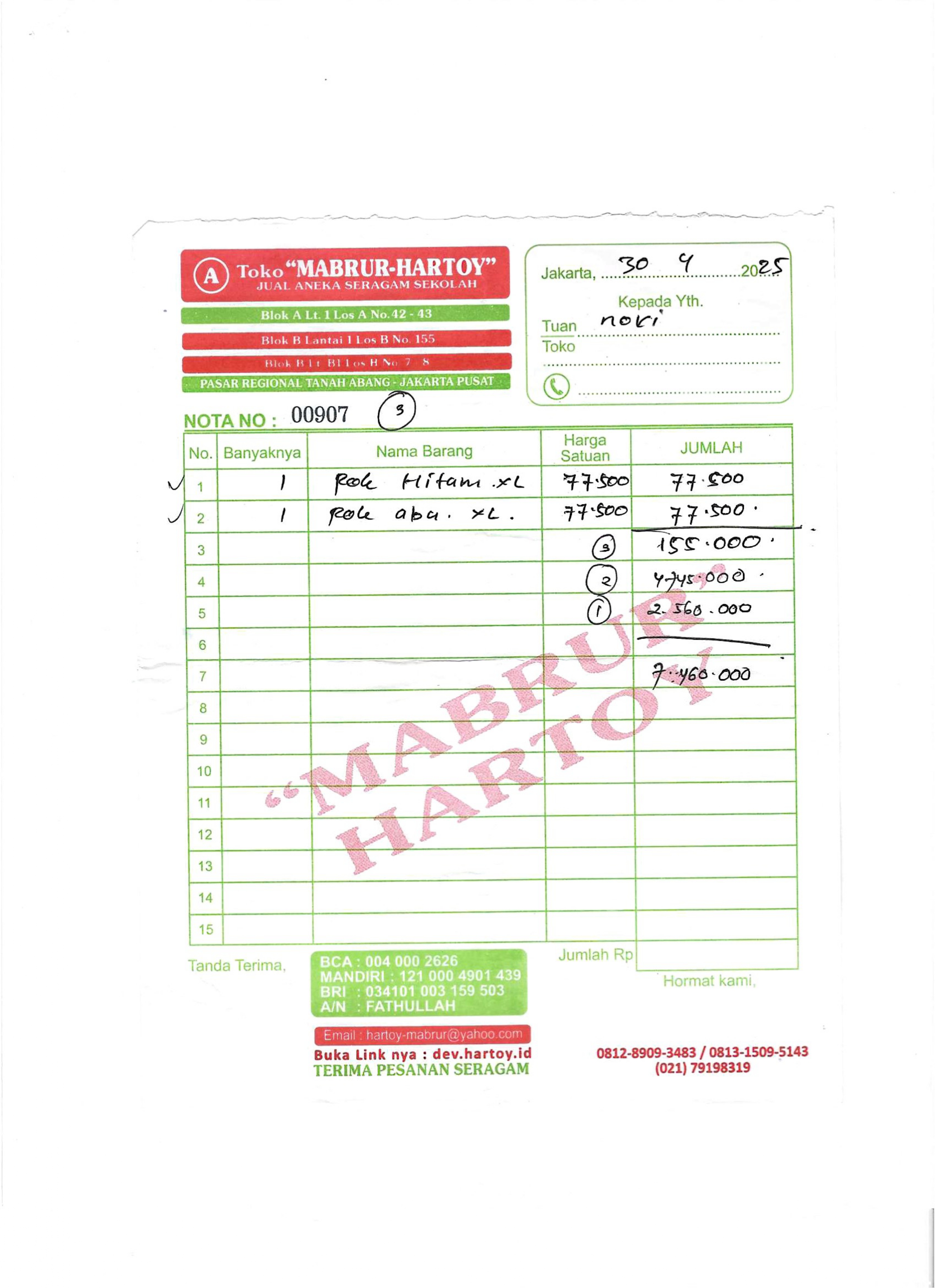 Dana digunakan untuk 1. Seragam sekolah untuk 30 anak x Rp 300.000 = Rp 9.000.000 2. Kebutuhan operasional dan biaya keperluan anak-anak panti asuhan Rp74.283.7532025-04-14 08:58:04