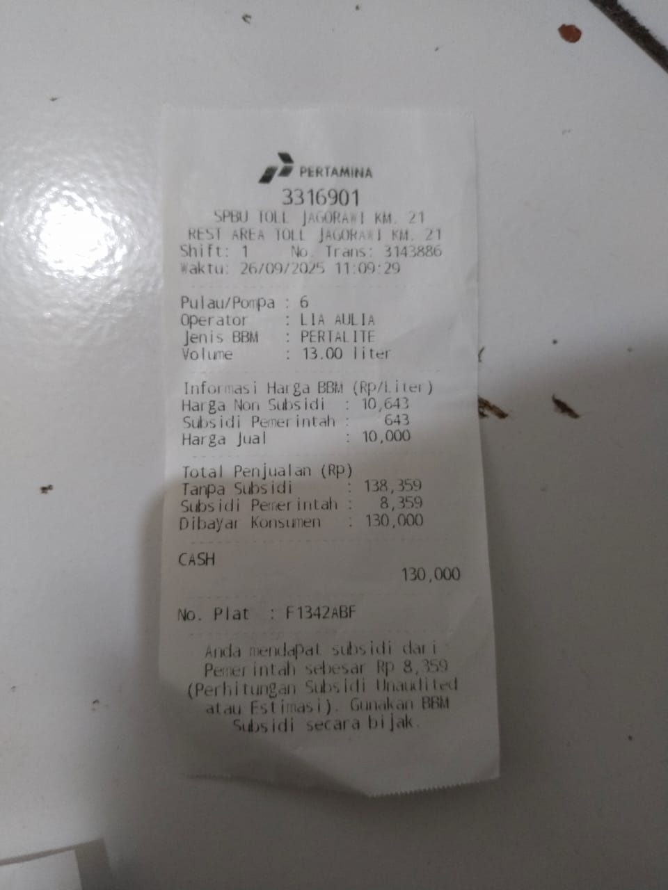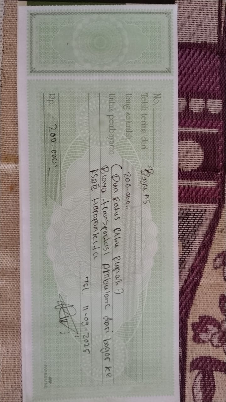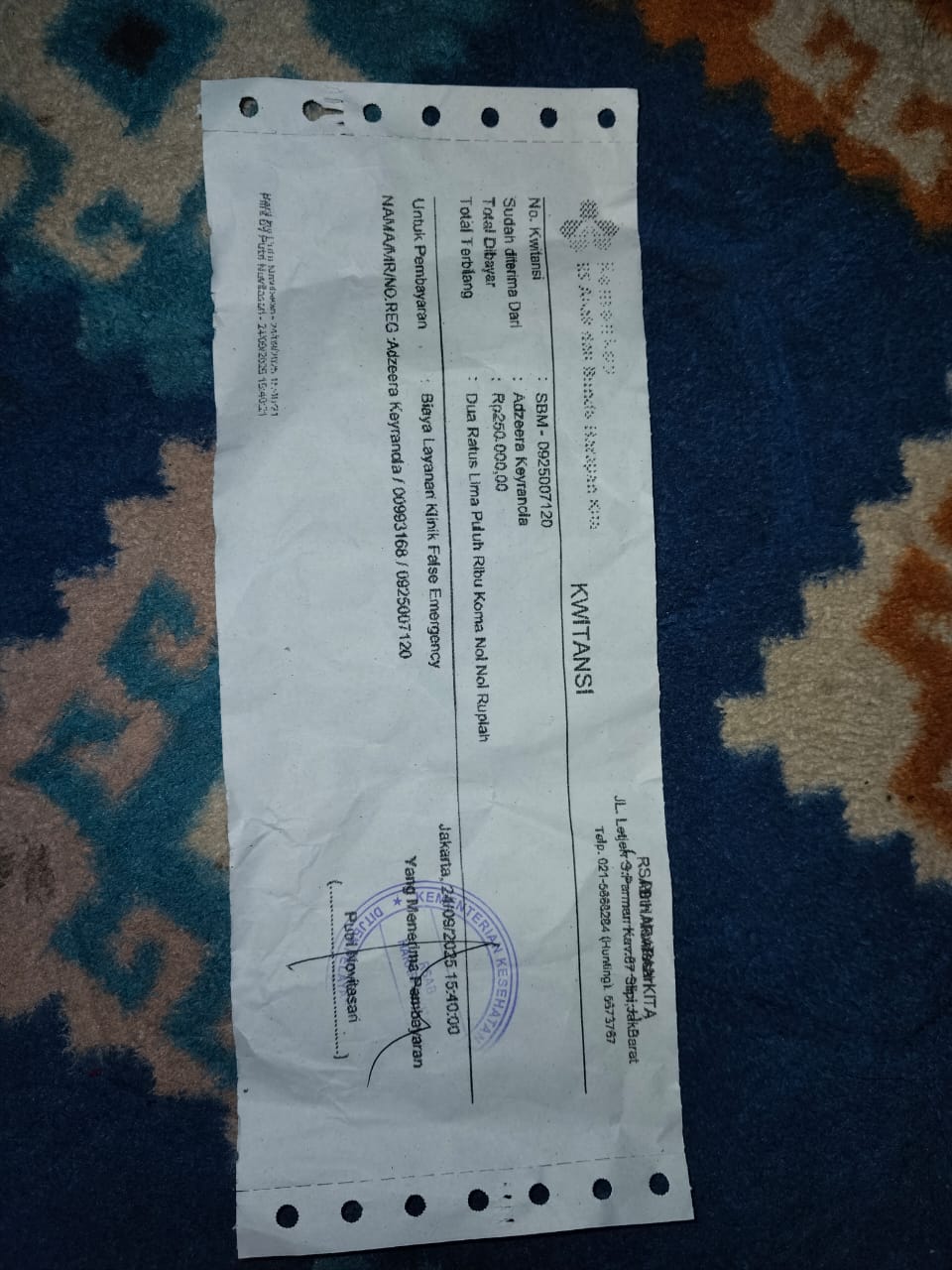 Dana digunakan untuk 1. Biaya kontrol ke Klinik nutrisi dan metabolik MRI Rp1.800.000 2. Susu sgm gen100 Rp104,000 × 7 kotak = Rp728,000 3. Ganti selang Ngt Rp250,000 4. Transportasi online mobil dari bogor ke rsab harapan kita PP Rp,700,000 5, Pampers sweety Rp54,000 × 2 = Rp108,0002025-10-07 10:20:29