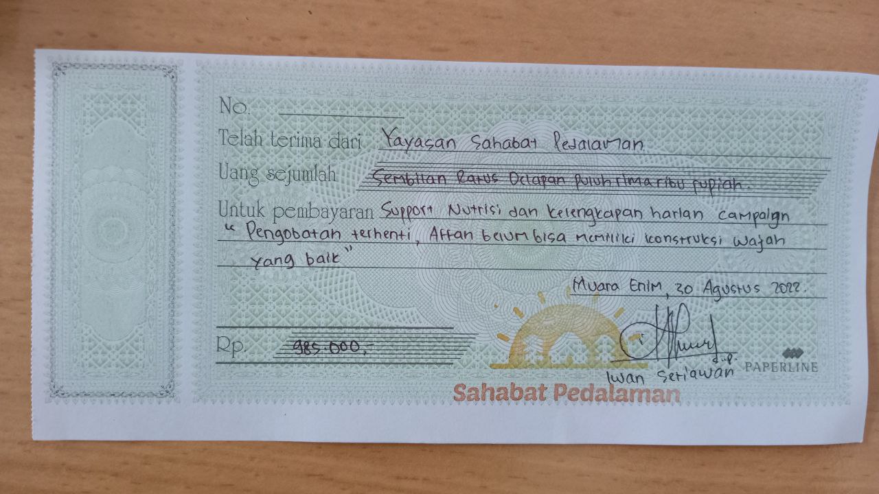 TemanBaik, kondisi Affan ini butuh bantuanmu, konstruksi wajahnya yang kurang sempurna mengakibatkan dia juga kesulitan saat makan. Mari, kita bersama membantu Affan untuk bisa meneruskan proses pengobatannya dengan cara: