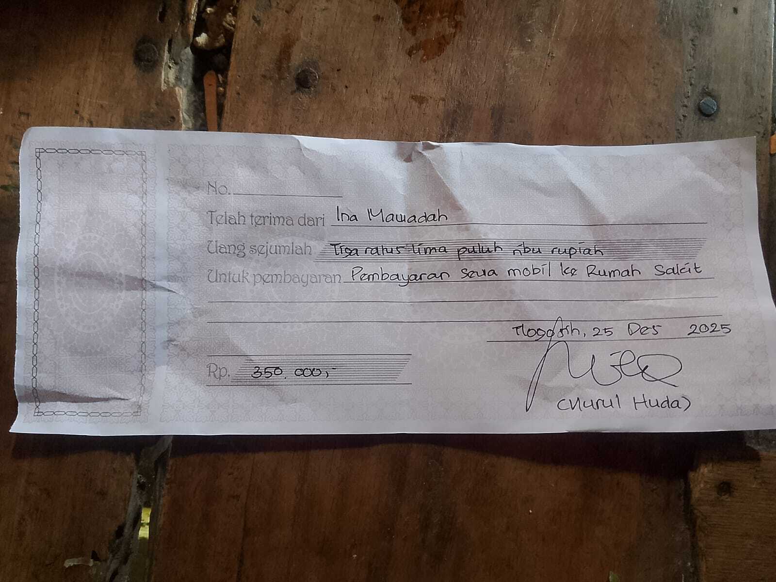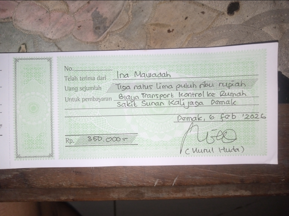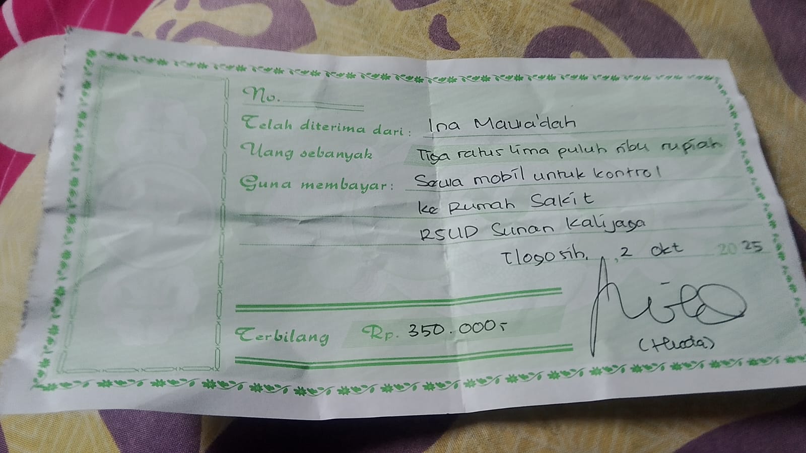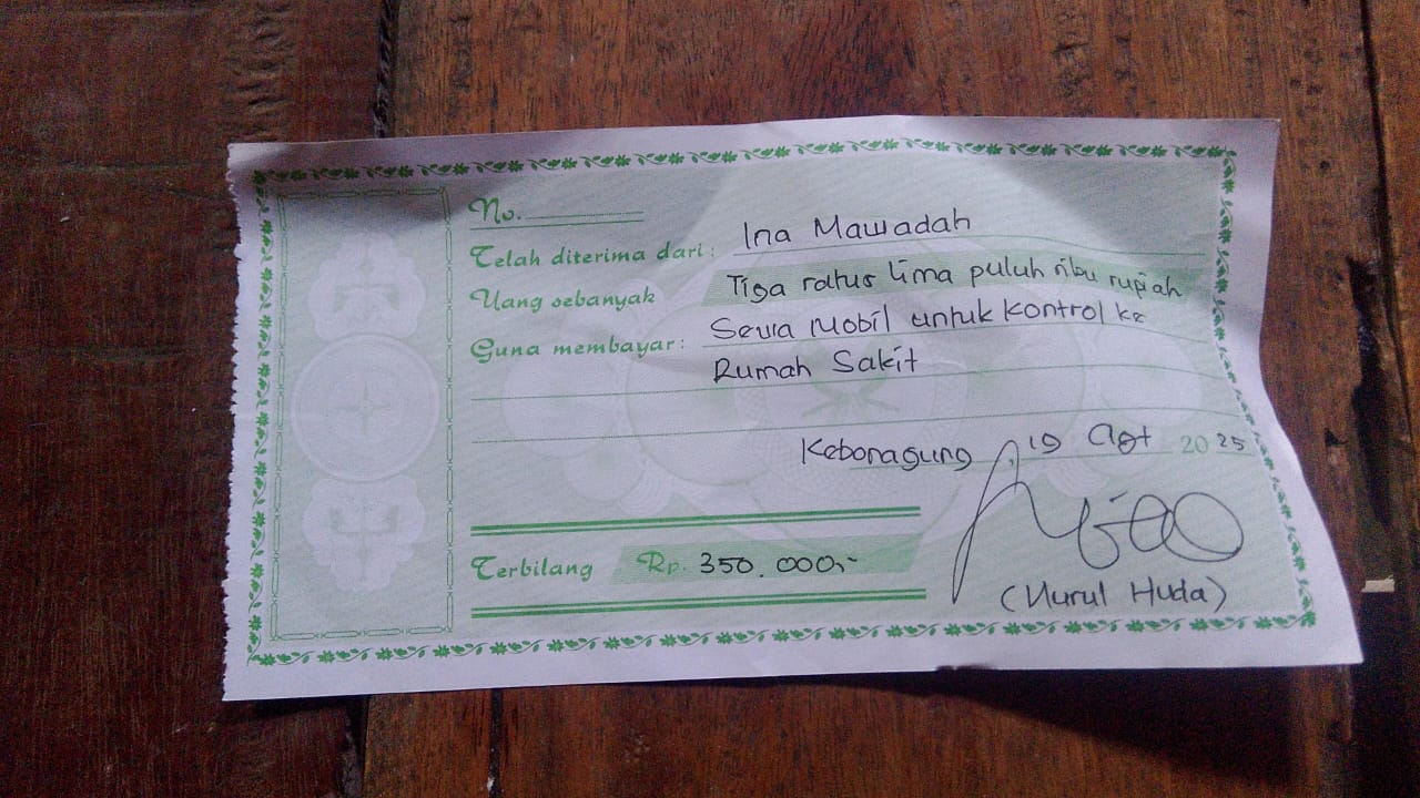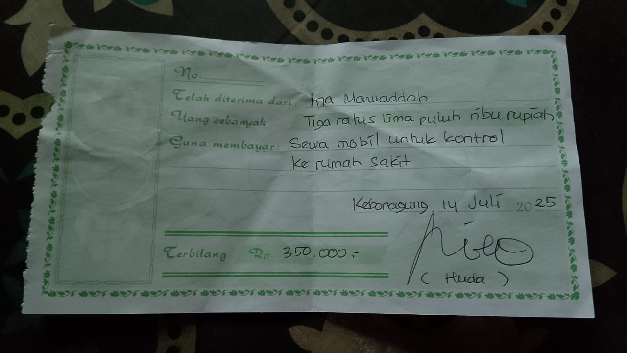 Sudah kesekian kalinya Afif bisa mencairkan donasi dari BenihBaik.com. Alhamdulillah, bantuan dari #TemanBaik sangat membantu dan meringankan keuangan kami sebagai orang tua Afif.Pada hari Senin, 14 Juli 2025, Afif menjalani kontrol rutin untuk menebus obat epilepsi. Alhamdulillah, berkat donasi ini juga, Afif bisa kembali menyewa mobil untuk berangkat ke rumah sakit.