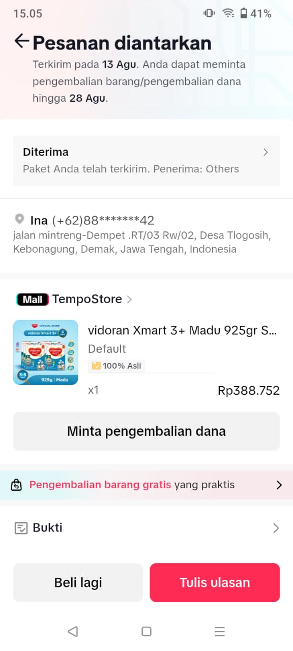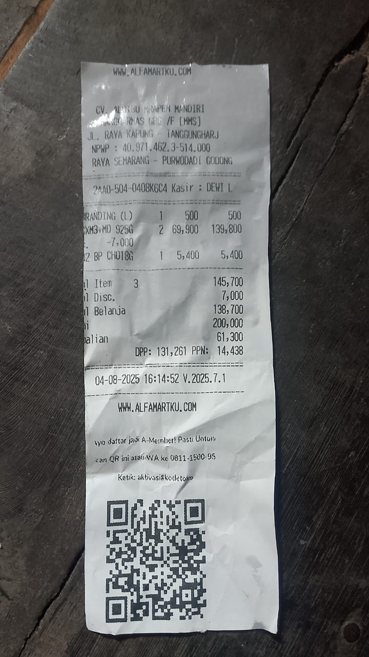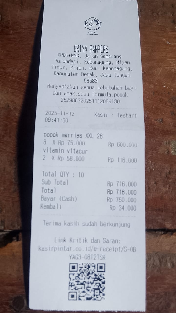 Dana digunakan untuk 1.Susu vidorant Rp75.000 × 10dus = Rp750.000 2.Pampers meries XXL Rp85.000 × 8 = Rp680.000 3.Vitamin Apylis 100mil Rp100.0002025-04-29 09:11:30