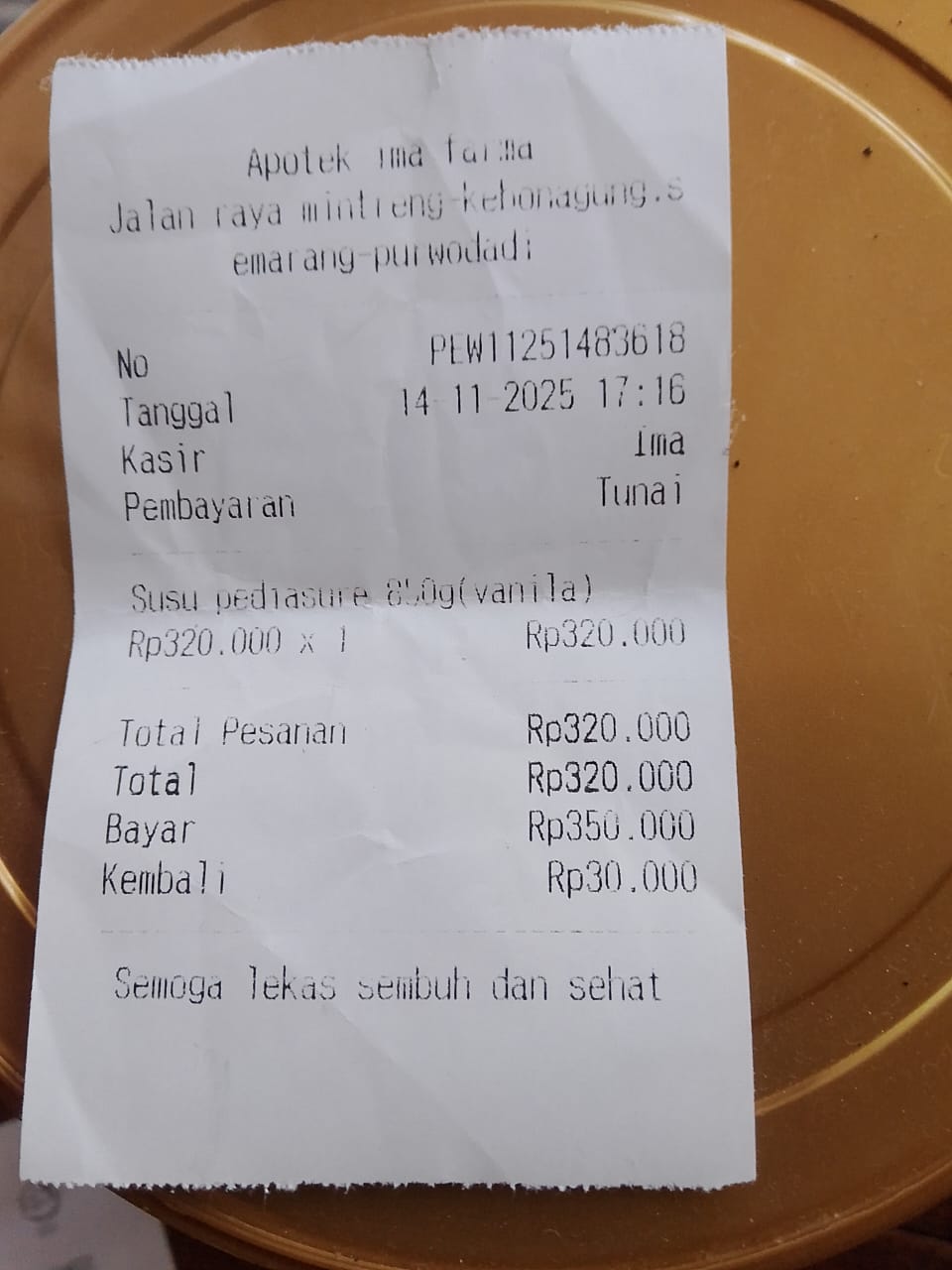 Dana digunakan untuk 1. Susu vidorant 10 × Rp70.000 = Rp700.000 2. Susu pediasure Rp350.000 3. Vitamin vitacur 2 × Rp50.000 = Rp100.000 4. Sewa mobil kerumah sakit Rp350.000 5. Minyak kayu putih cap Lang Rp70.000 6. popok meries 6 × Rp80.000 = Rp640.0002025-11-06 10:29:27