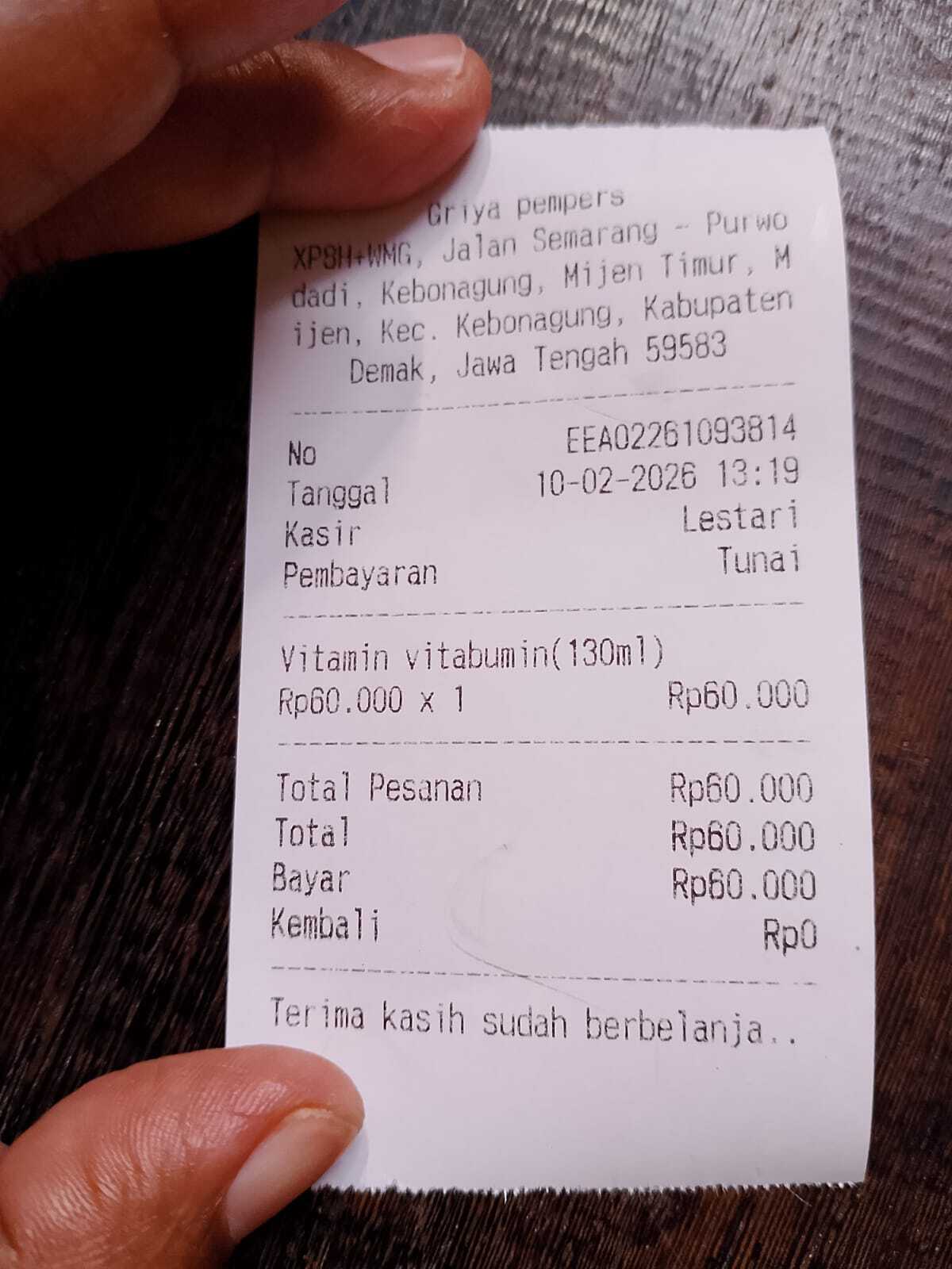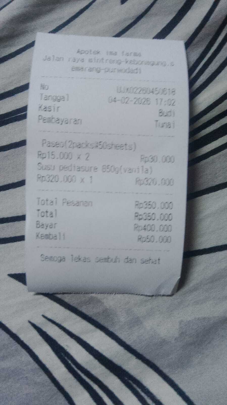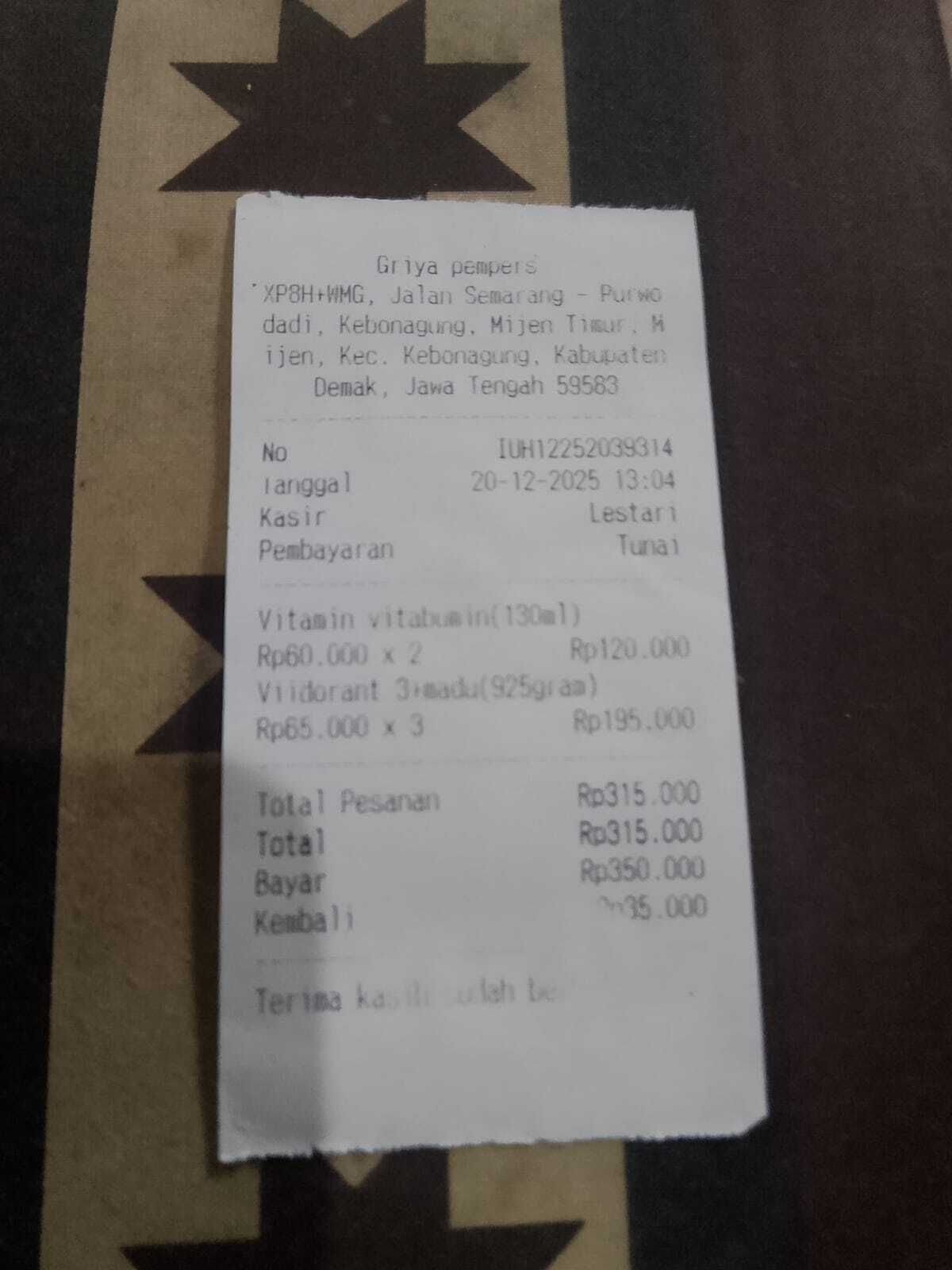 Dana digunakan untuk 1. Pampers merries 8× Rp70.000= Rp560.000 2. Susu vidorant10× Rp65.000= Rp650.000 3. Sewa mobil ke rumah sakit Rp350.000 4. Susu pediasure Rp350.000 5. Vitamin vitabumin 2×60.000= Rp120.000 6. Tissu basah+kering Rp50.000 7. Minyak kayu putih dan minyak telon Rp100.0002026-02-02 10:35:31