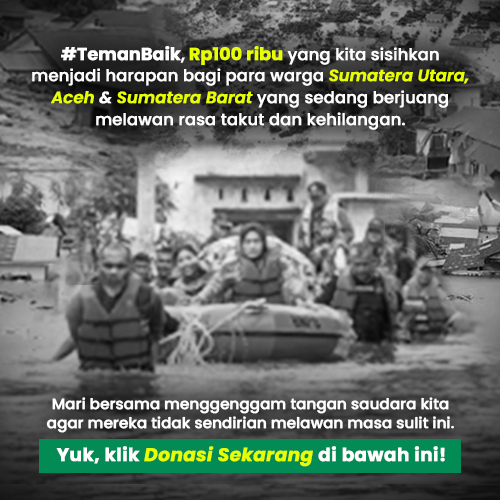 #TemanBaik, Rp100 ribu yang kita sisihkan menjadi harapan bagi para warga Sumatera Utara, Aceh, dan Sumatera Barat yang sedang berjuang melawan rasa takut dan kehilangan. mari bersama menggenggam tangan saudara kita agar mereka tidak sendirian melawan masa sulit ini. Yuk klik Donasi Sekarang di bawah ini!