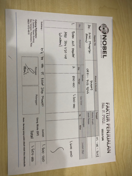 Dana dari TemanBaik sudah digunakan dengan baik untuk biaya terapi AVT 1 paket (4 kali sesi) 800.000 x 2 paket= Rp 1.600.000. Biaya transportasi pulang-pergi naik travel ke Hearing Center Pekanbaru Rp 300.000.