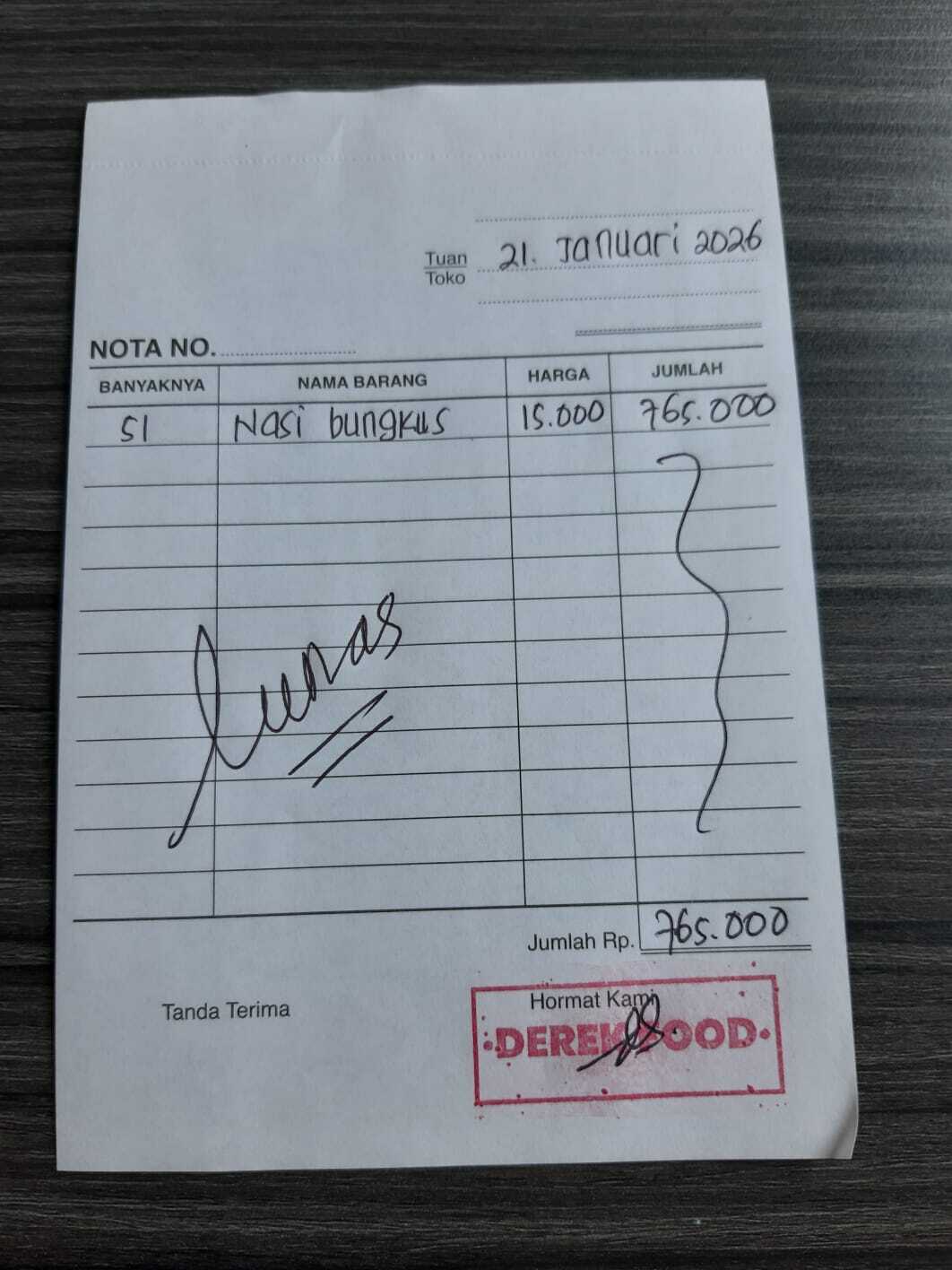 Dana digunakan untuk Pembelian nasi bungkus kegiatan berbagi di Surabaya Rp15.000 x 51pcs = Rp765.0002026-01-22 09:51:25