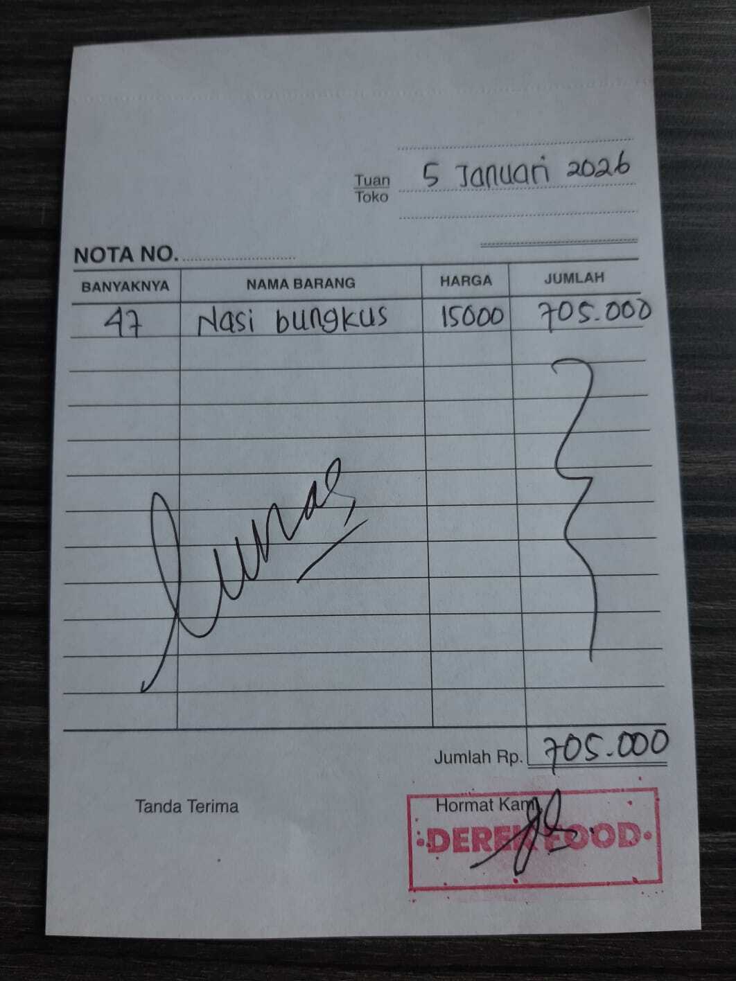 Dana digunakan untuk Nasi bungkus untuk Semarang 47 x Rp 15.000 = Rp 705.0002026-01-06 10:04:50