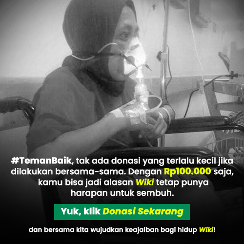#TemanBaik, tak ada donasi yang terlalu kecil jika dilakukan bersama-sama. Dengan Rp100.000 saja, kita bisa jadi alasan Wiki tetap punya harapan untuk sembuh. Yuk, klik Donasi Sekarang dan bersama kita wujudkan keajaiban bagi hidup Wiki!