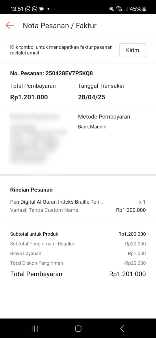 Adapun rincian bantuan dari TemanBaik sudah dipakai untuk, pembelian Al Quran braille tunanetra digital Pen 1.077.300 x 2= Rp2.154.600 dan sisanya digunakan untuk biaya ongkos kirim Rp 219.807.