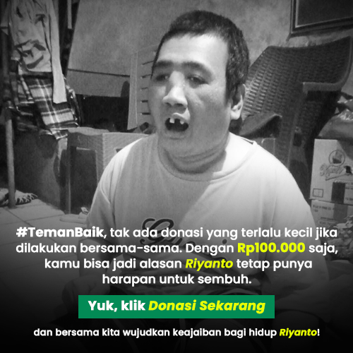 #TemanBaik, tak ada donasi yang terlalu kecil jika dilakukan bersama-sama. Dengan Rp100.000 saja, kita bisa jadi alasan Riyanto tetap punya harapan. Yuk, klik Donasi Sekarang dan bersama kita wujudkan keajaiban bagi hidup Riyanto!