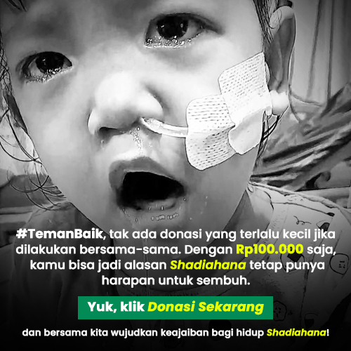 #TemanBaik, tak ada donasi yang terlalu kecil jika dilakukan bersama-sama. Dengan Rp100.000 saja, kita bisa jadi alasan Shadiahana tetap punya harapan untuk sembuh. Yuk, klik Donasi Sekarang dan bersama kita wujudkan keajaiban bagi hidup Shadiahana!