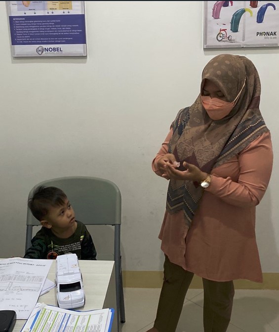 Sekarang ini, anakku sudah punya sepasang alat bantu dengar, dan kegiatannya sekarang menjalani proses terapi setiap harinya.