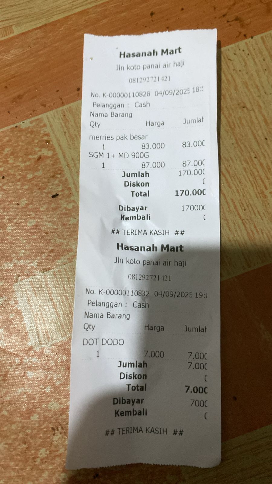 Dana digunakan untuk 1. Susu SGM 1kg Rp90.000 2. Pampers Meries ukuran L Rp85.0002025-04-10 09:31:33