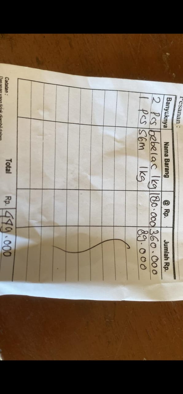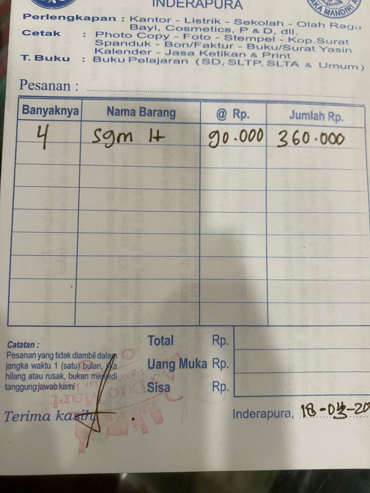 1. Susu Bebelac Rp180.000 x 2 dus = Rp320.000 2. Pampers Seety Rp60.000 x 3 ball = Rp180.0002025-02-27 09:49:31