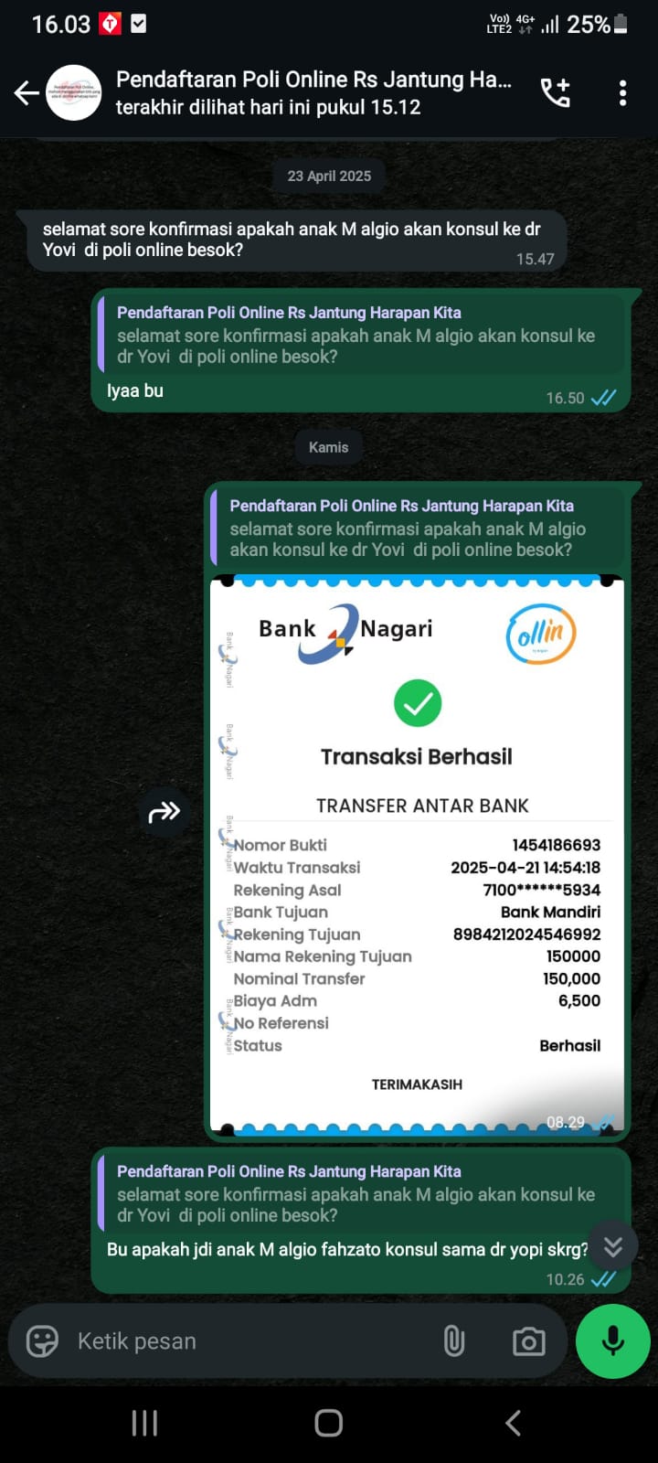 Dana digunakan untuk 1. Susu SGM Rp.90.000 x 9 dus = Rp810.000 2. Pampers Rp83.000 x 3 ball = Rp249.000 3. Poli online ke HARKIT Rp.150.000 4.Transportasi Travel ke RS Jamil padang Rp150.000 5. Biaya konsumsi kontrol Rp116.0002025-04-16 09:59:36