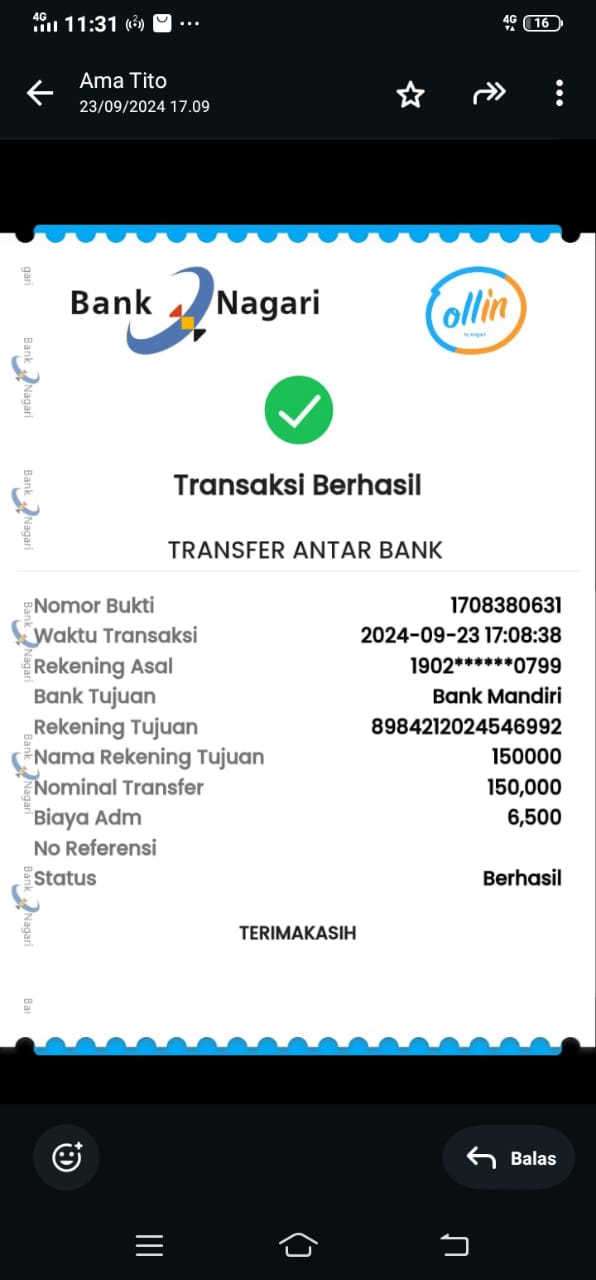Ke rekening ****031090531 a/n NEZA NOVELLA