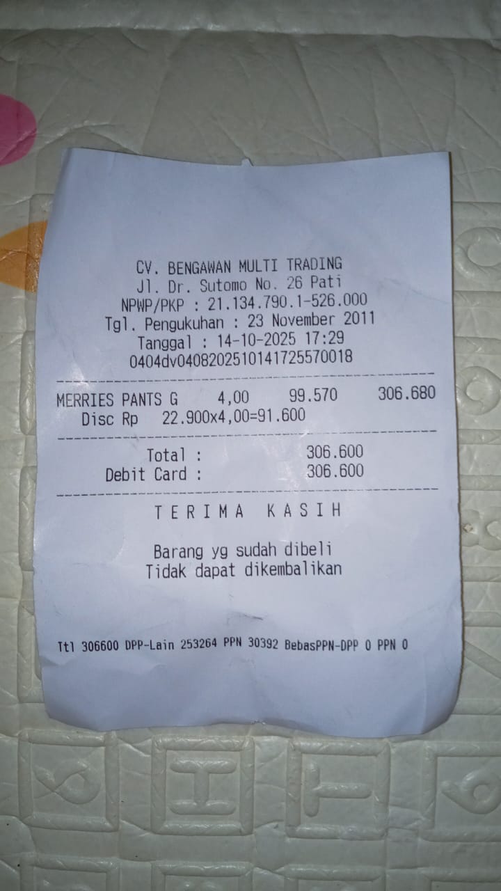 Dana digunakan untuk Pampers Merries Pants 4ball Rp360.0002025-10-15 09:01:27
