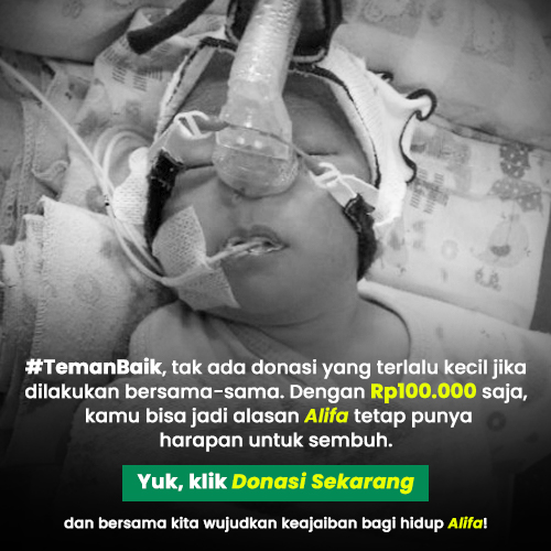 #TemanBaik, tak ada donasi yang terlalu kecil jika dilakukan bersama-sama. Dengan Rp100.000 saja, kita bisa jadi alasan Alifa tetap punya harapan untuk sembuh. Yuk, klik Donasi Sekarang dan bersama kita wujudkan keajaiban bagi hidup Alifa!