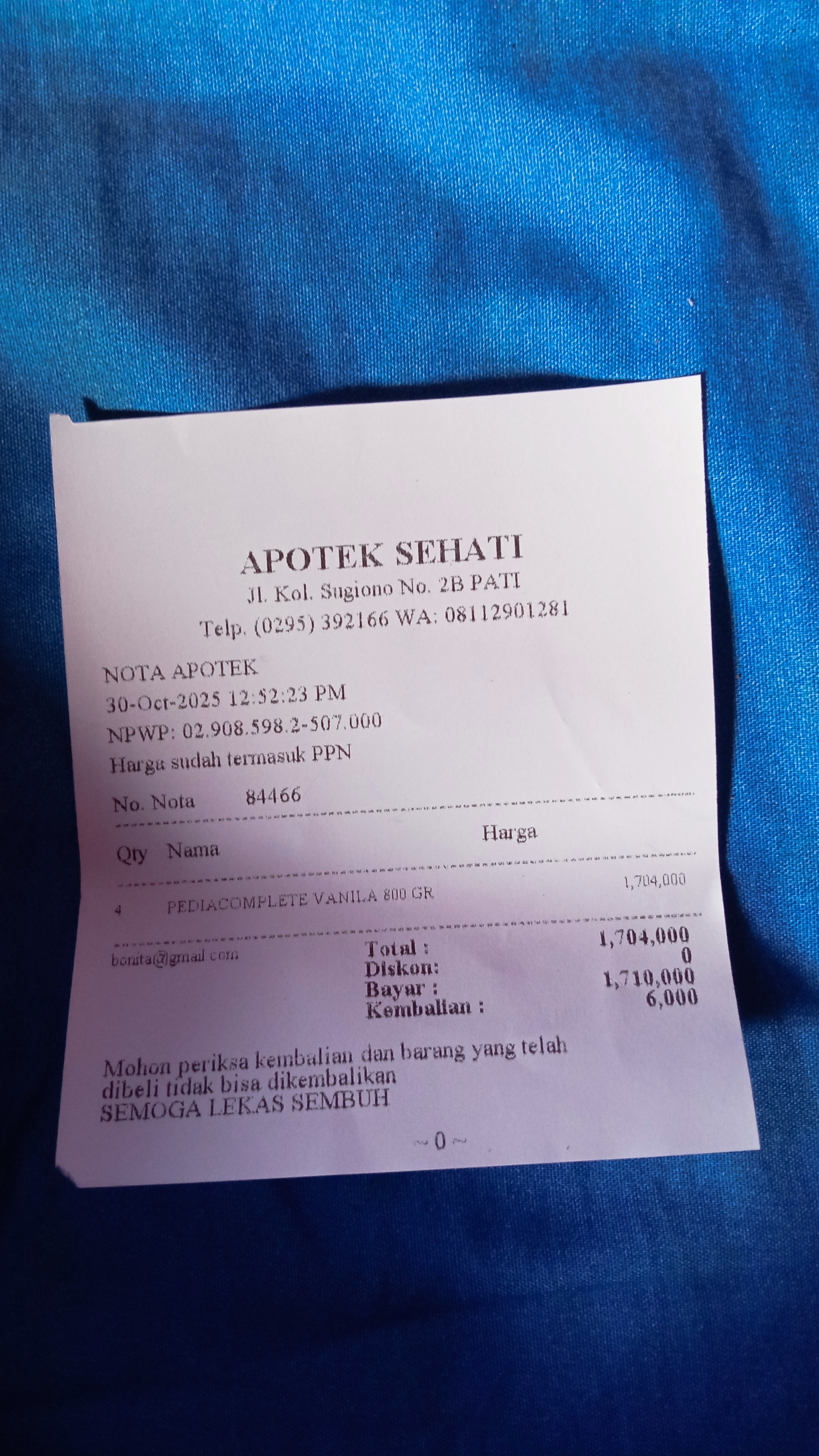 Saya ingin menginformasikan bahwa dana sudah digunakan untuk membeli susu Pedia Complete sebanyak 4 kaleng ukuran 800 gram di Apotek Sehati Pati dengan total pembelian Rp1.704.000.