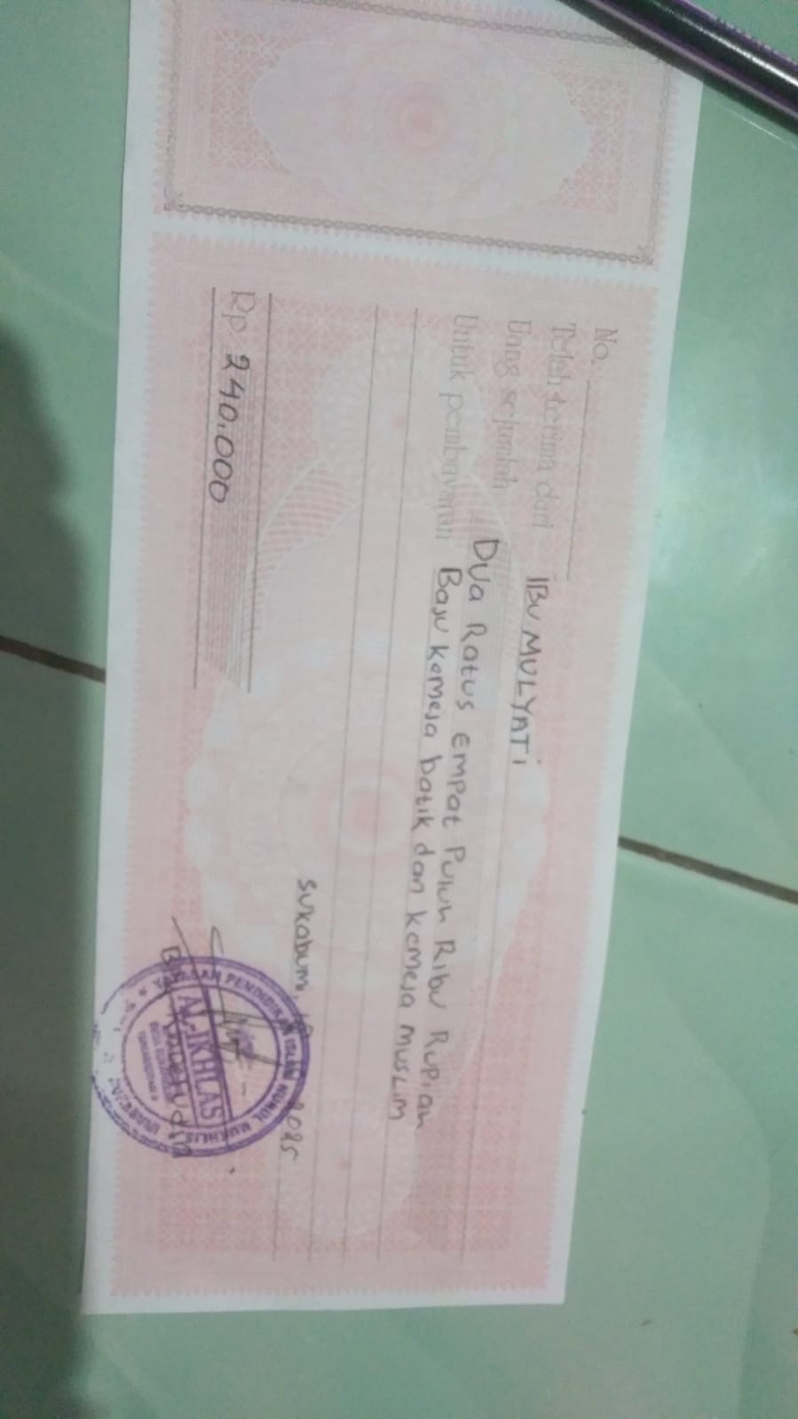 Dana digunakan untuk 1. Pembelia seragam dan batik Rp150.000 2. Pembelian sepatu sekolah Rp150.0002025-10-09 10:19:26