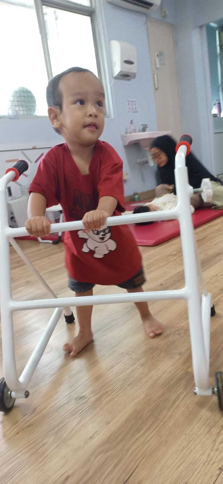 Saat ini, kondisi anakku lebih banyak diam karena belum lancar berbicara. Namun, setiap menjalani terapi motorik dan belajar berjalan, senyum cerianya selalu hadir, walau batuk-batuk masih datang karena masalah paru-parunya. Ia juga mengalami gizi buruk karena hanya mampu menerima asupan susu
