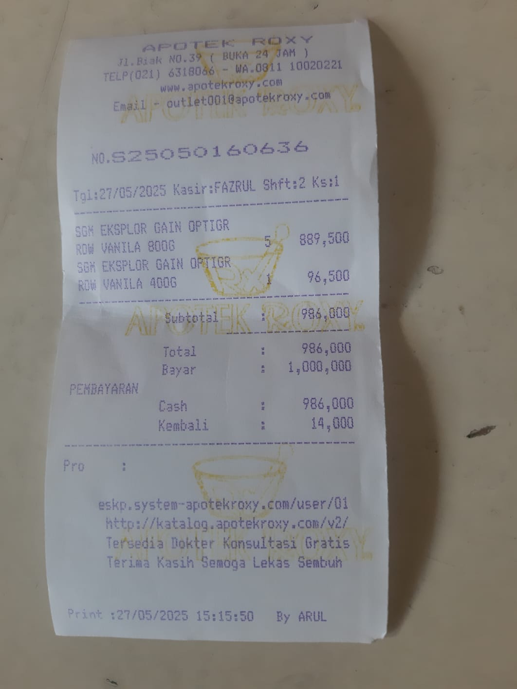 Dana digunakan untuk 1. Pampers Rp90.000 x 7 = Rp630.000 2. Susu SGM Gain Optigrow Rp180.000 x 6dus = Rp1.080.000 3. Vitamin Ferriz Drop Rp.48.701 4. Apialys Drop Rp 61.688 5. Tempra Rp 26.235 6. Vitamin Rp112.500 7. Vitamin OtakRp120.500 8. Transportasi isi kartu busway ke RS Cipto sebulan Rp300.0002025-06-23 10:01:35