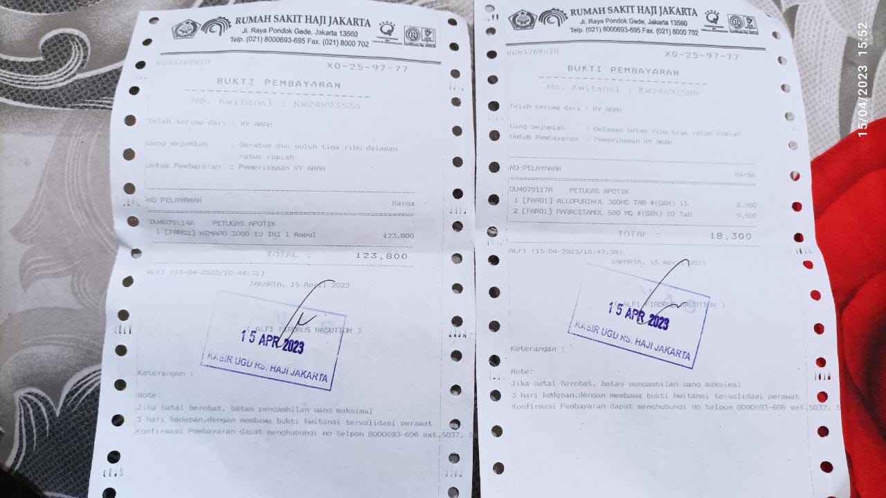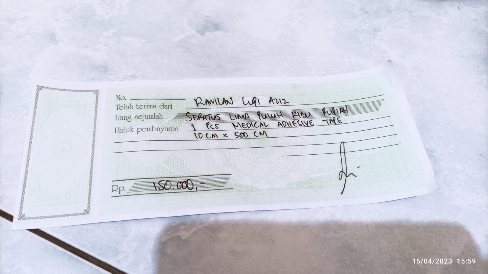 Dana digunakan untuk 1. Plester Hypafix Rp185.000 2. Pembelian obat-obatan Rp50.000 3. Biaya transportasi gocar pulang-pergi ke RS Haji Jakarta Rp300.000.2023-04-11 18:22:57