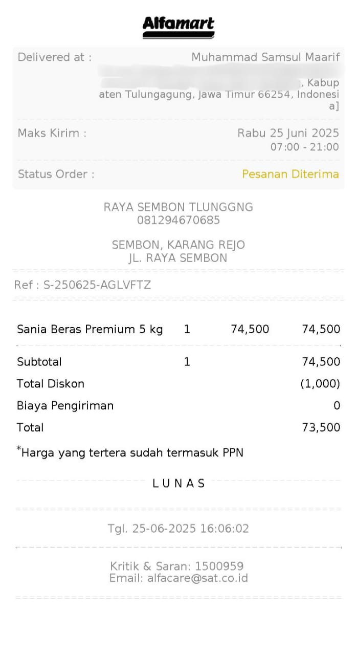 Dana digunakan untuk 1. Reimburse Tiket dari jakarta ke Tulungagung 2 orang Rp640.000 2. Beras 4kg Rp60.0002025-06-19 09:21:18