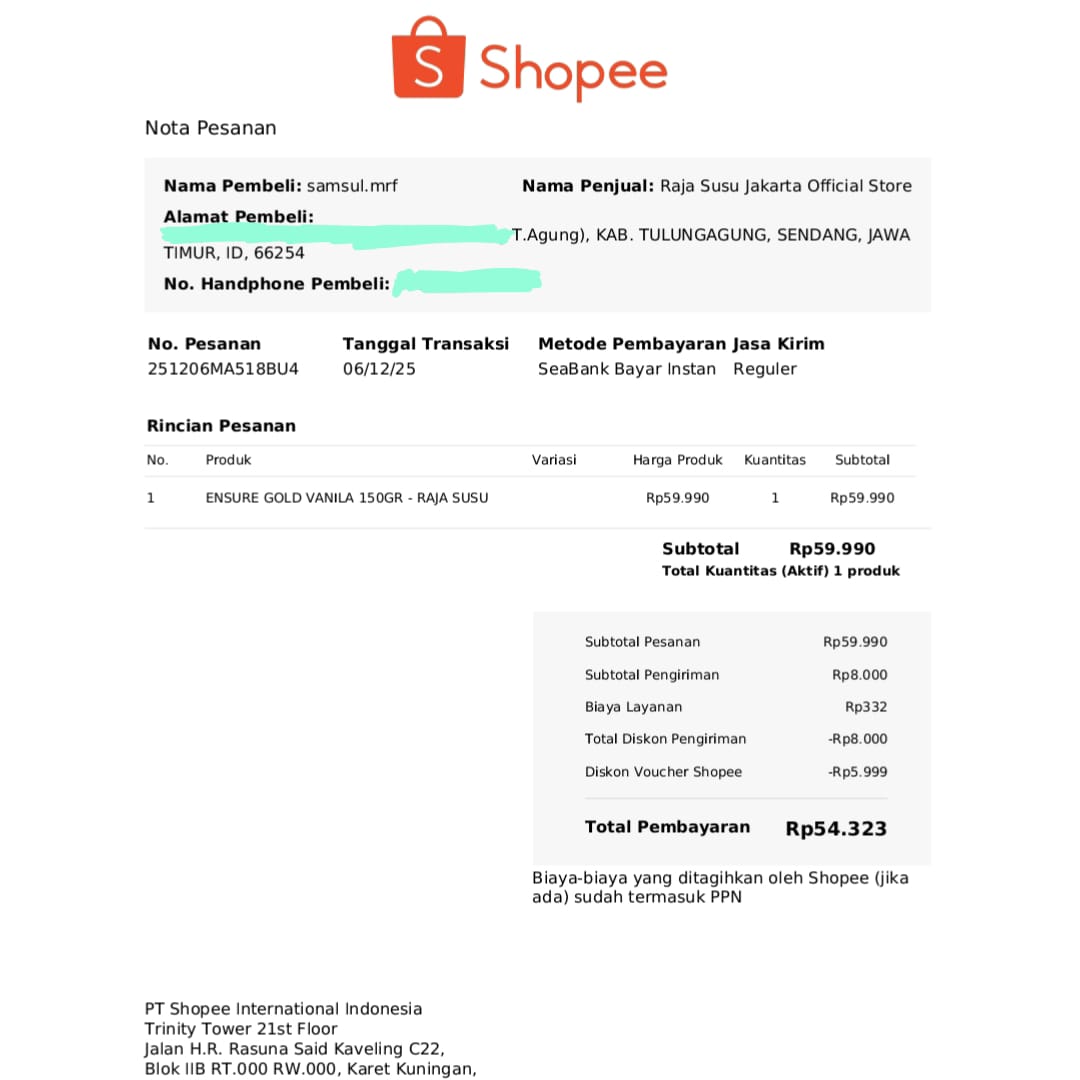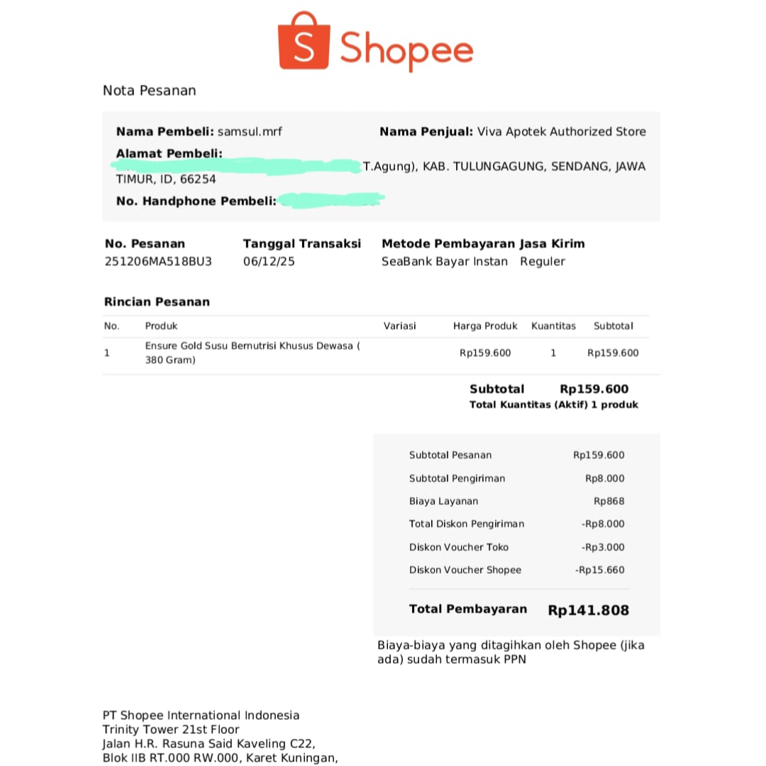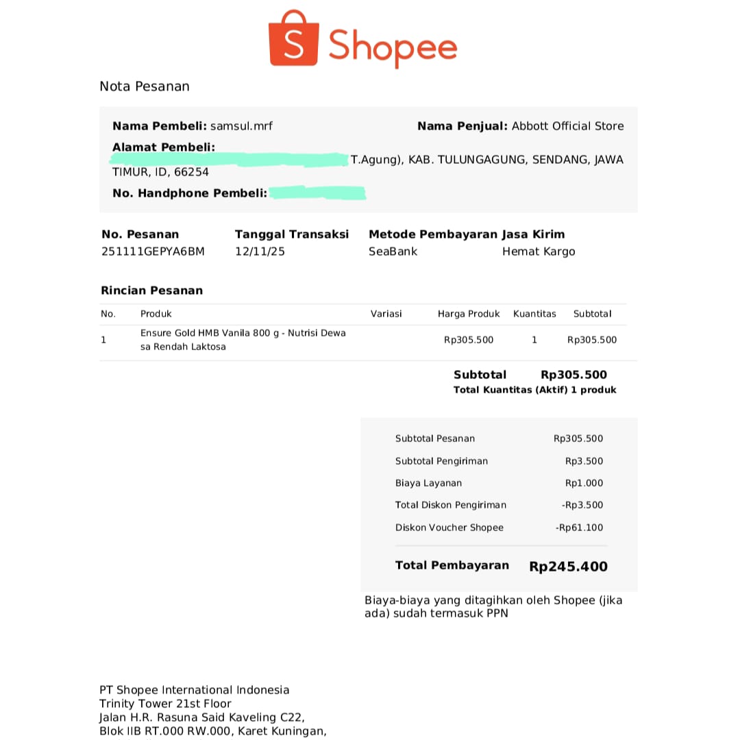 Dana digunakan untuk 1. Transportasi dari Tulungagung ke Jakarta PP 2 orang Rp1.400.000 2. Susu Ensure Gold HMB Vanila 800g Rp305.000 3. Susu Ensure Gold 380g Vanila Rp148.000 4. Susu Ensure Gold 150g Vanila Rp60.0002025-12-09 08:24:23