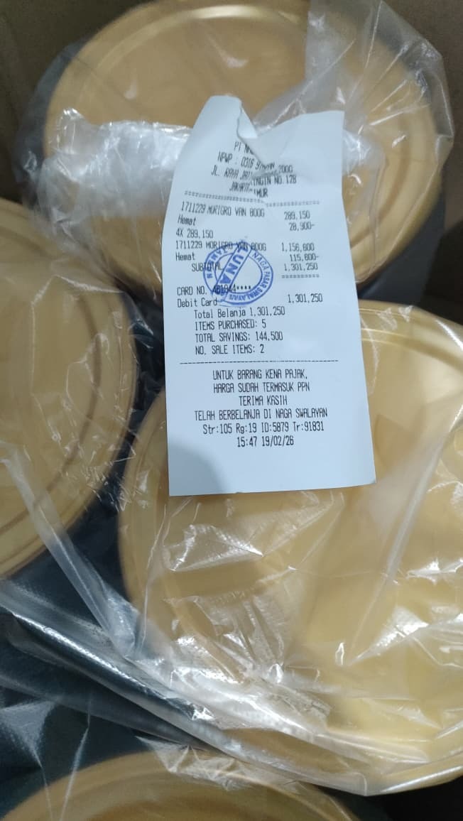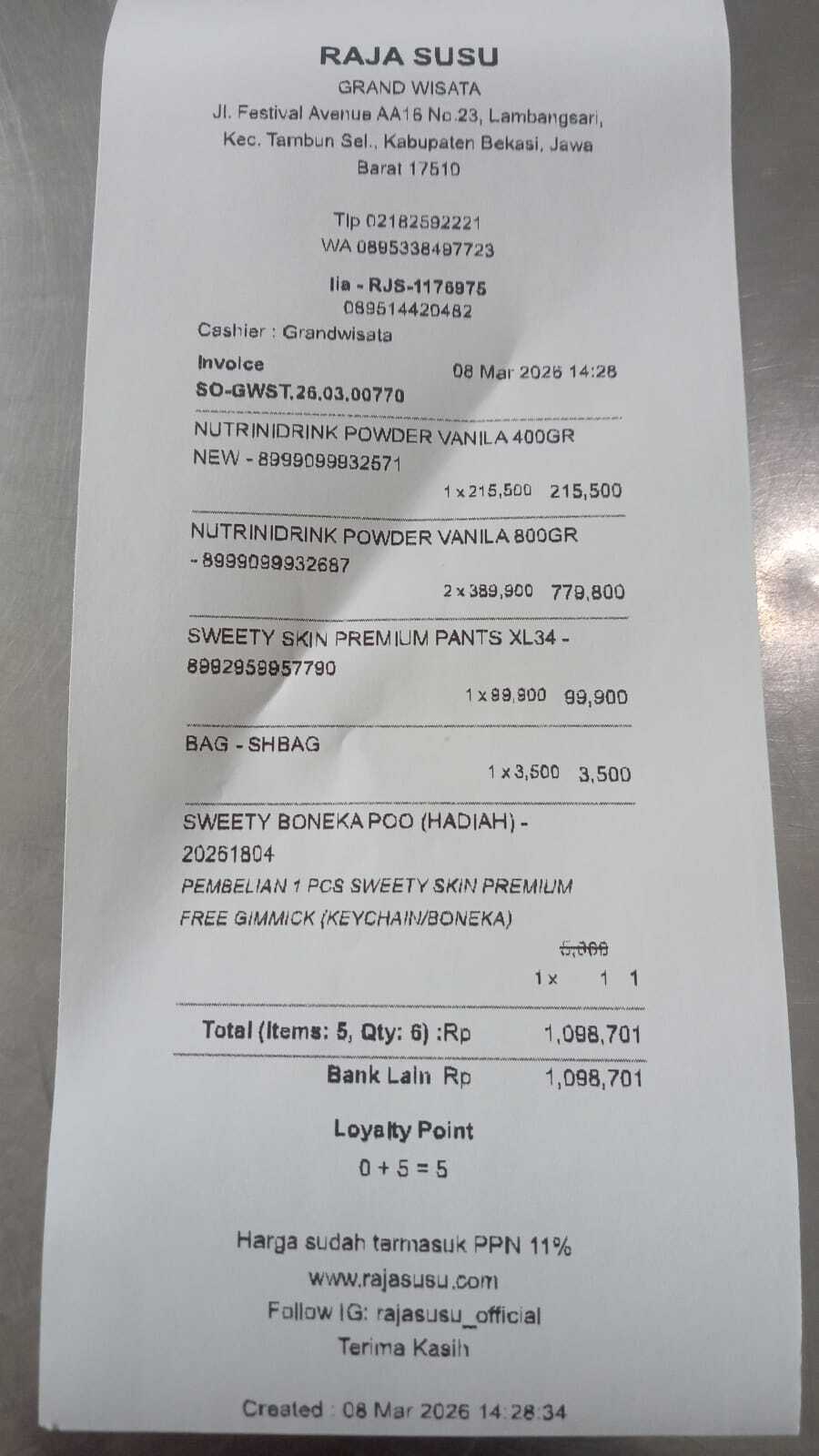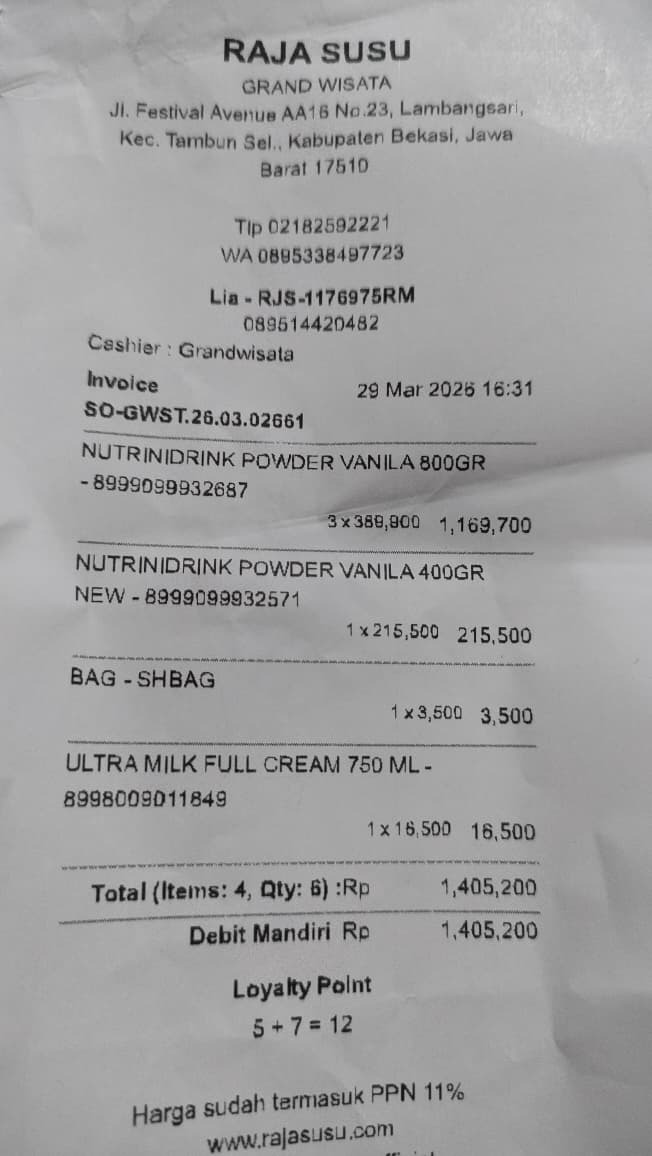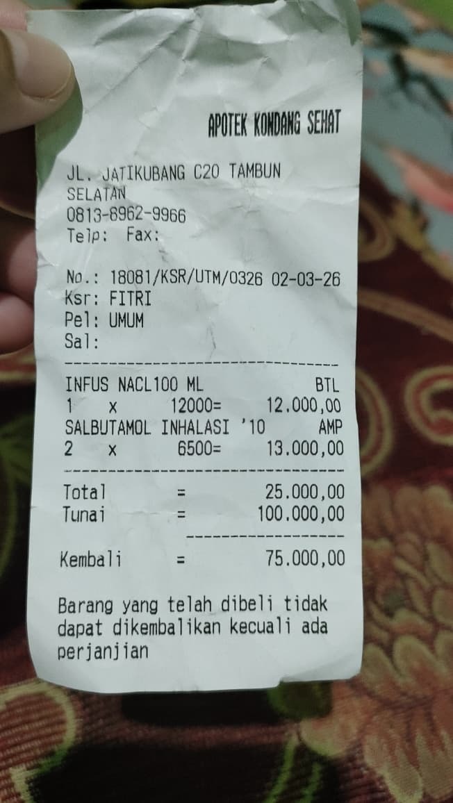 Dana digunakan untuk 1. Susu Nutrinidrink Rp.420.000x3 kaleng = Rp1.260.000 2. Tisu basah 12.000 x 4 = Rp48.000 3. Pampers makuku slim ukuran xl Rp65.000 x 2 = Rp130.000 4. Tisu kering Rp11.000x4 pak = Rp44.0002026-03-30 11:56:50