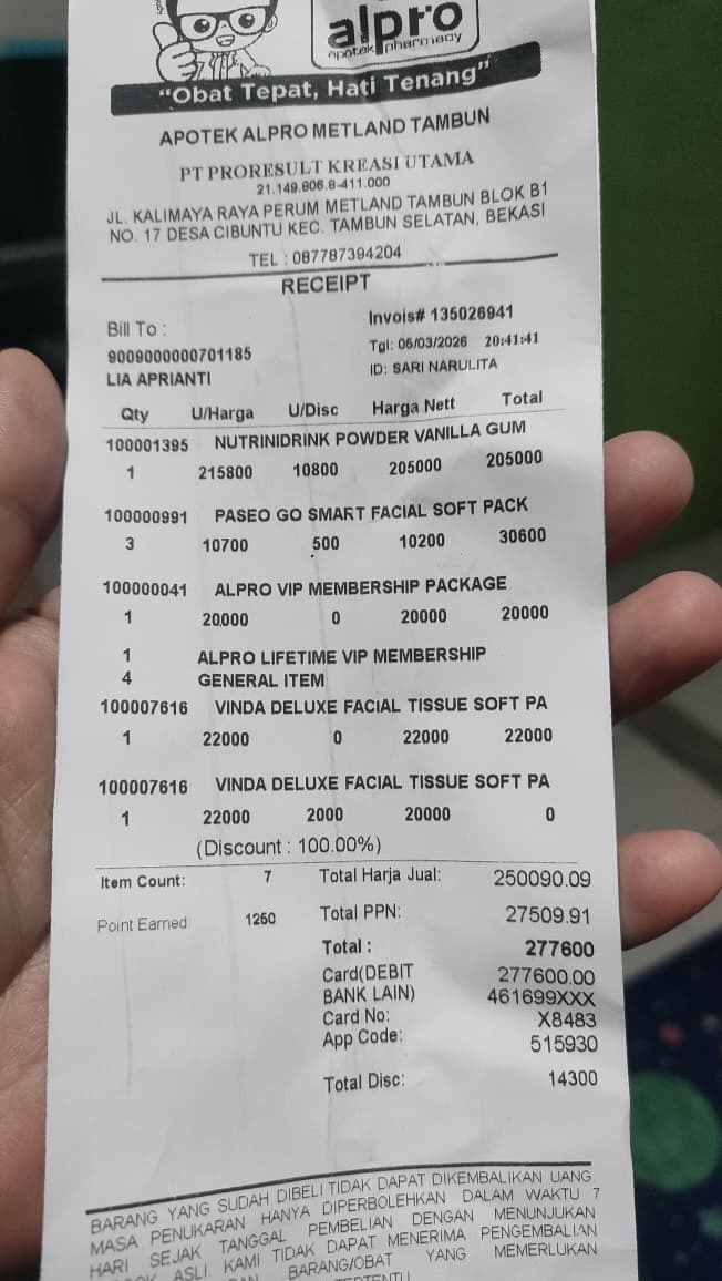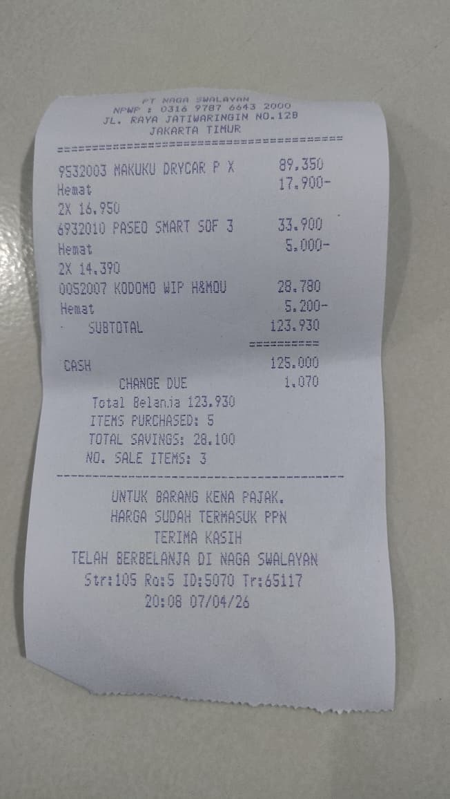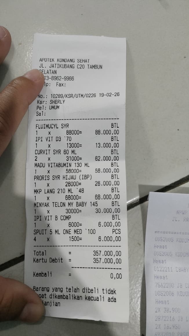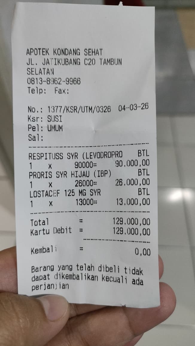 Dana digunakan untuk 1. Susu Nutrinidrink Rp.420.000x3 kaleng = Rp1.260.000 2. Tisu basah 12.000 x 4 = Rp48.000 3. Pampers makuku slim ukuran xl Rp65.000 x 2 = Rp130.000 4. Tisu kering Rp11.000x4 pak = Rp44.0002026-03-30 11:56:50