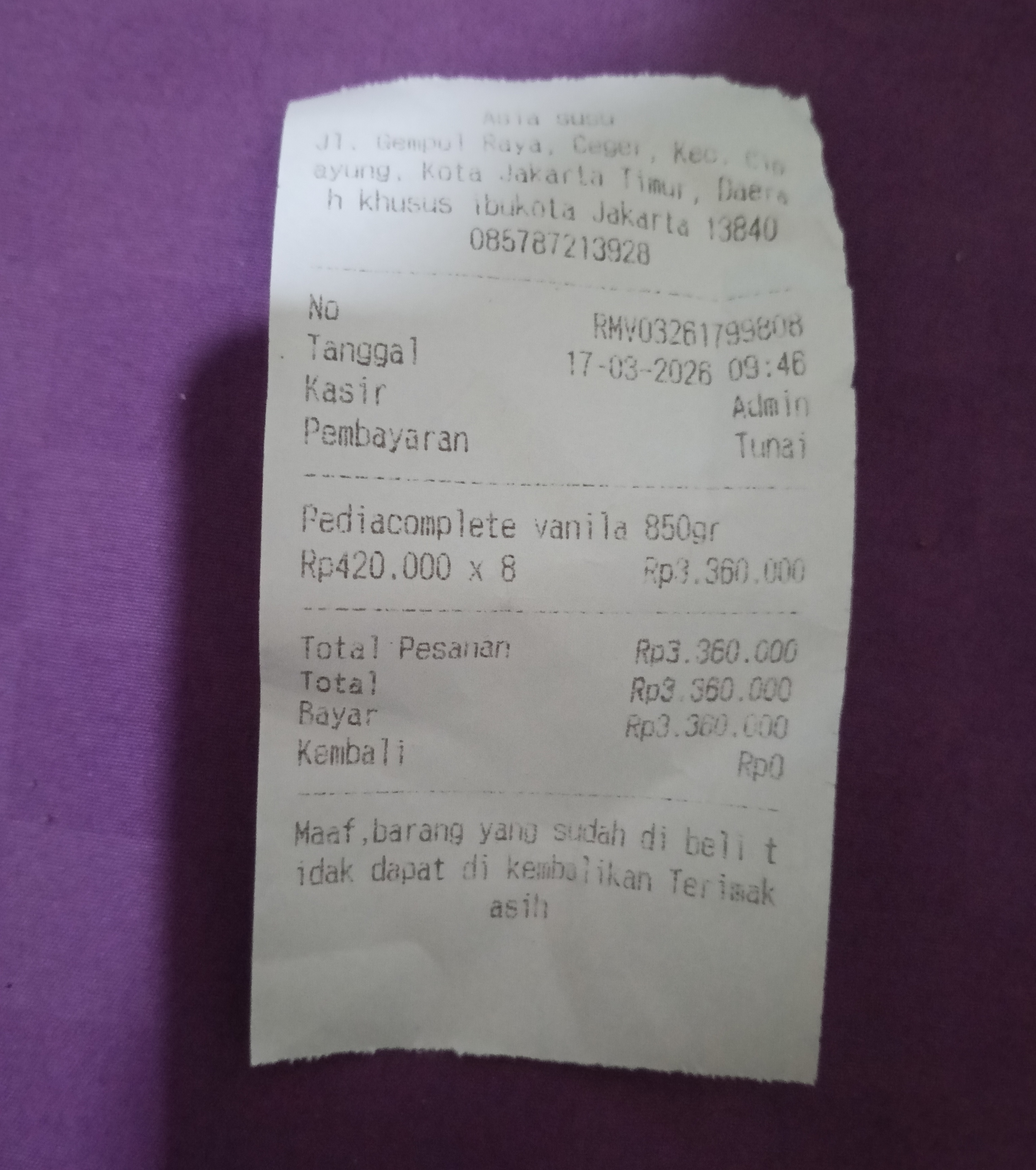 Dana digunakan untuk Susu pediacomplete vanila Rp420.000x 8= Rp3.360.0002026-03-13 14:56:42
