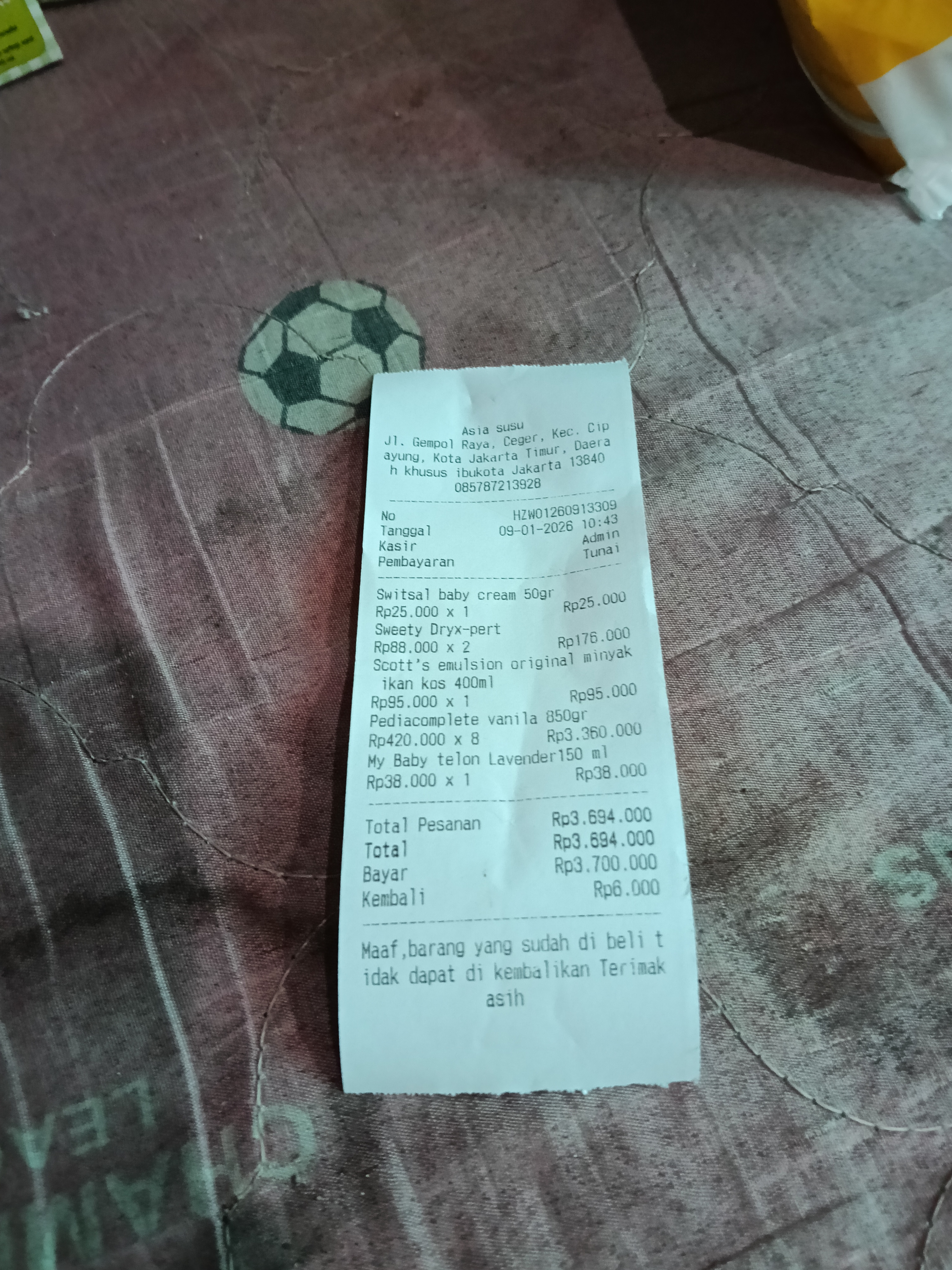 Dana digunakan untuk 1. Susu pedia complete Rp.420.000 x 9 kaleng = Rp3.780.000 2. Susu NutriniDRINK Rp440.000 3. Pampres mamypoko Rp.75.000 x 3 bal =Rp.225.0002025-09-15 09:16:06