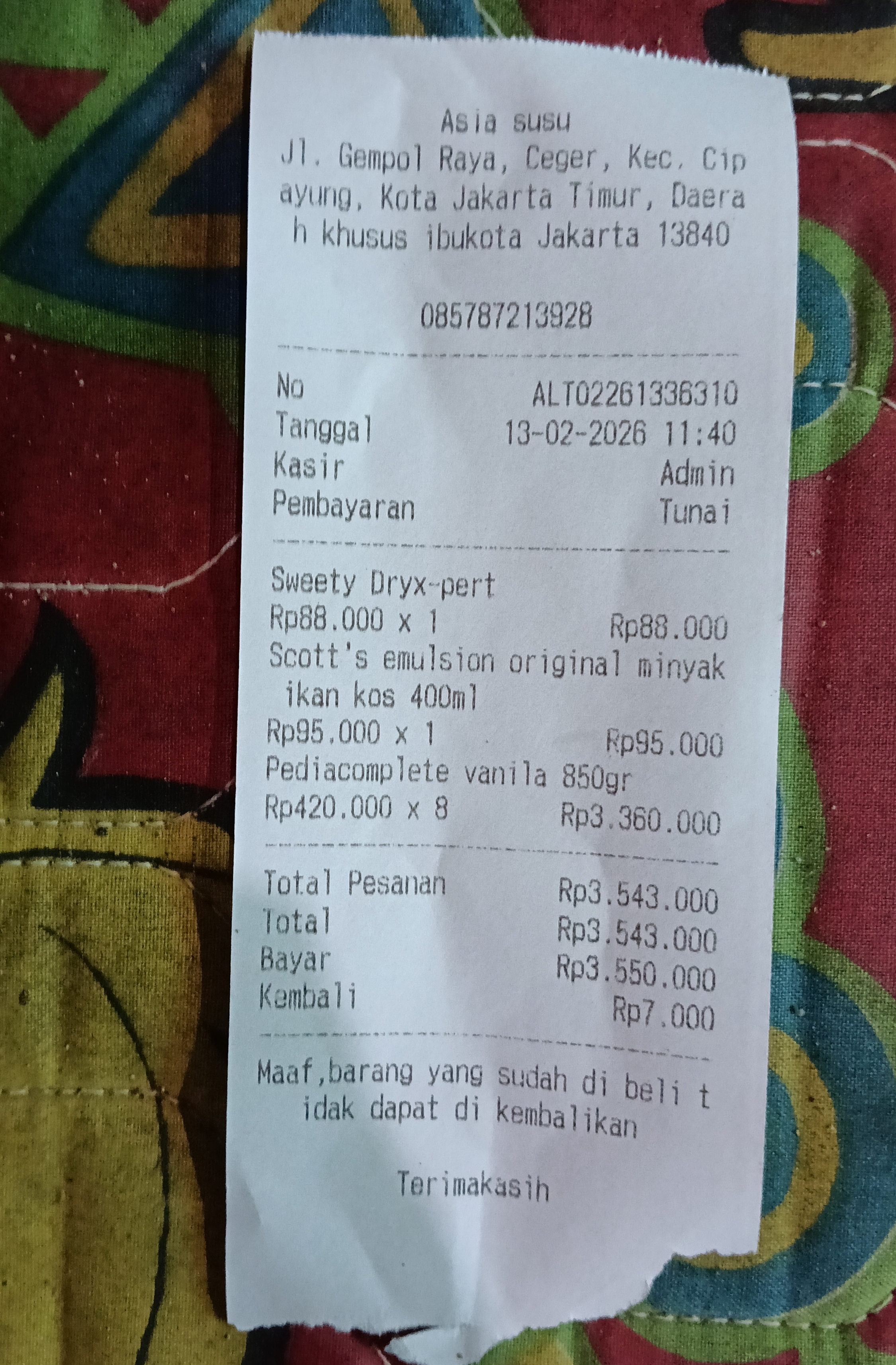 Dana digunakan untuk 1. Susu pediacomplete Rp420.000 x 8 kaleng= Rp3.360.000 2. Pampres sweety ukuran L Rp88.000 3. Vitamin minyak ikan Rp95.0002026-02-10 17:11:42