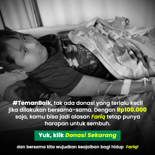 #TemanBaik, tak ada donasi yang terlalu kecil jika dilakukan bersama-sama. Dengan Rp100.000 saja, kita bisa jadi alasan Fariq tetap punya harapan untuk sembuh. Yuk, klik Donasi Sekarang dan bersama kita wujudkan keajaiban bagi hidup Fariq!