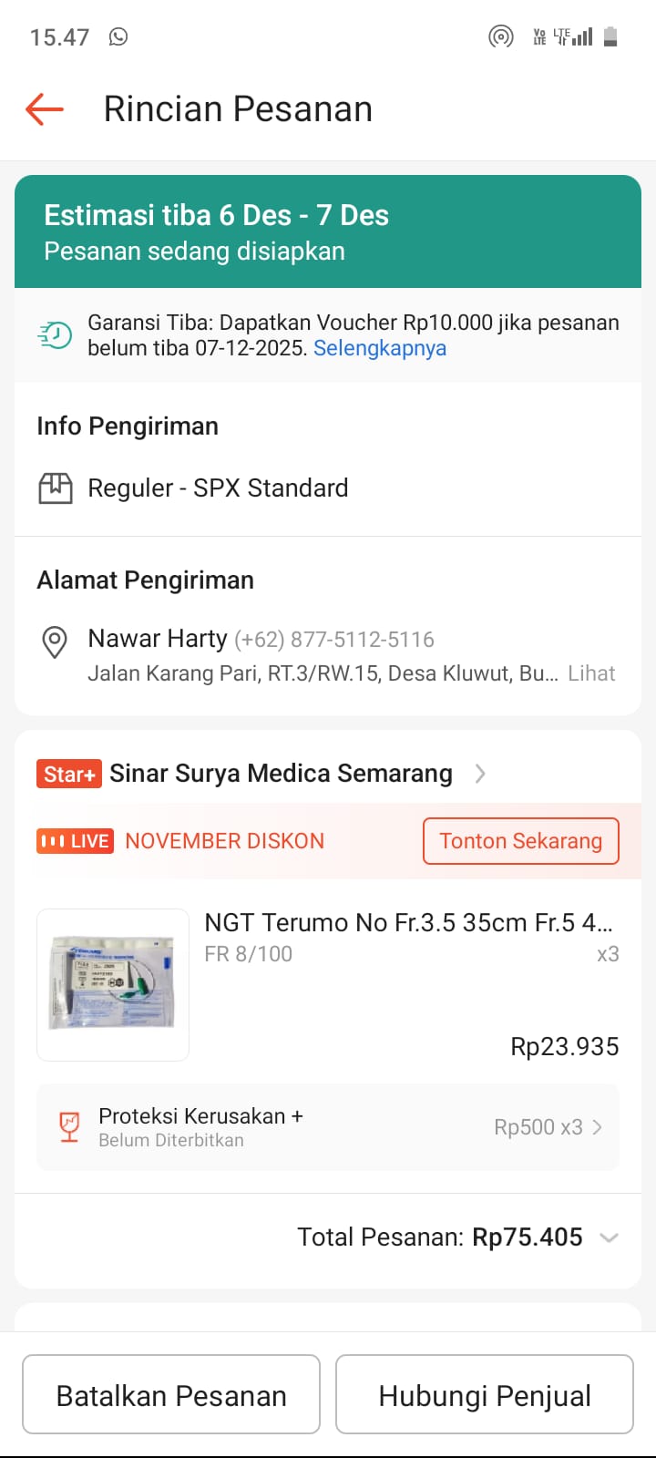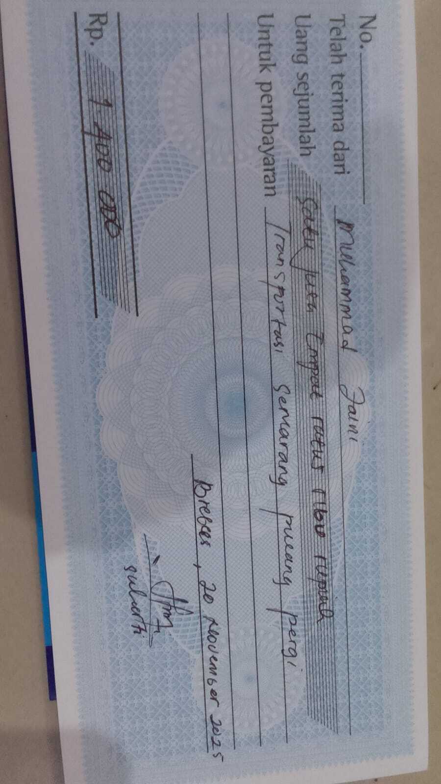 Dana digunakan untuk 1. Transportasi PP kontrol semarang Rp 1.400.000 2. susu sgm Rp98.000×4= Rp392.000 3. pempes sweety M Rp52.000×3= Rp156.000 4. tisu basah Rp18.000×4=Rp72.000 5. tisu kering Rp6900×10= Rp69.000 7. minyak telon Rp34.000×3= Rp102.000 8. Nesle Rp18.000×7= Rp126.000 9. selang ngt Rp25.000×3 = Rp75.000 10. penginapan 2 malem Rp200.0002025-11-18 10:26:26