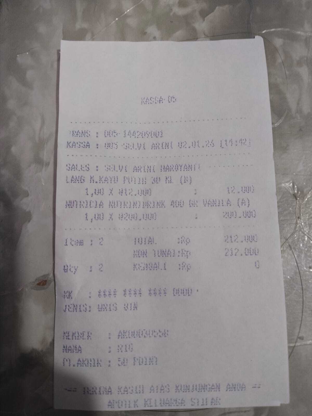 Dana digunakan untuk 1. Susu Nutrinidrink Rp 200.000 2. Minyak kayu putih kecil Rp17.0002025-12-30 10:33:14
