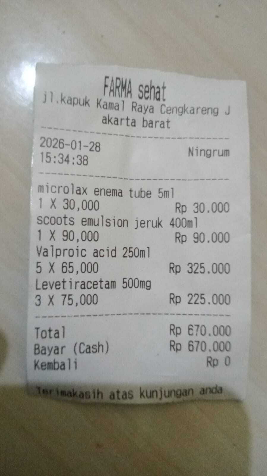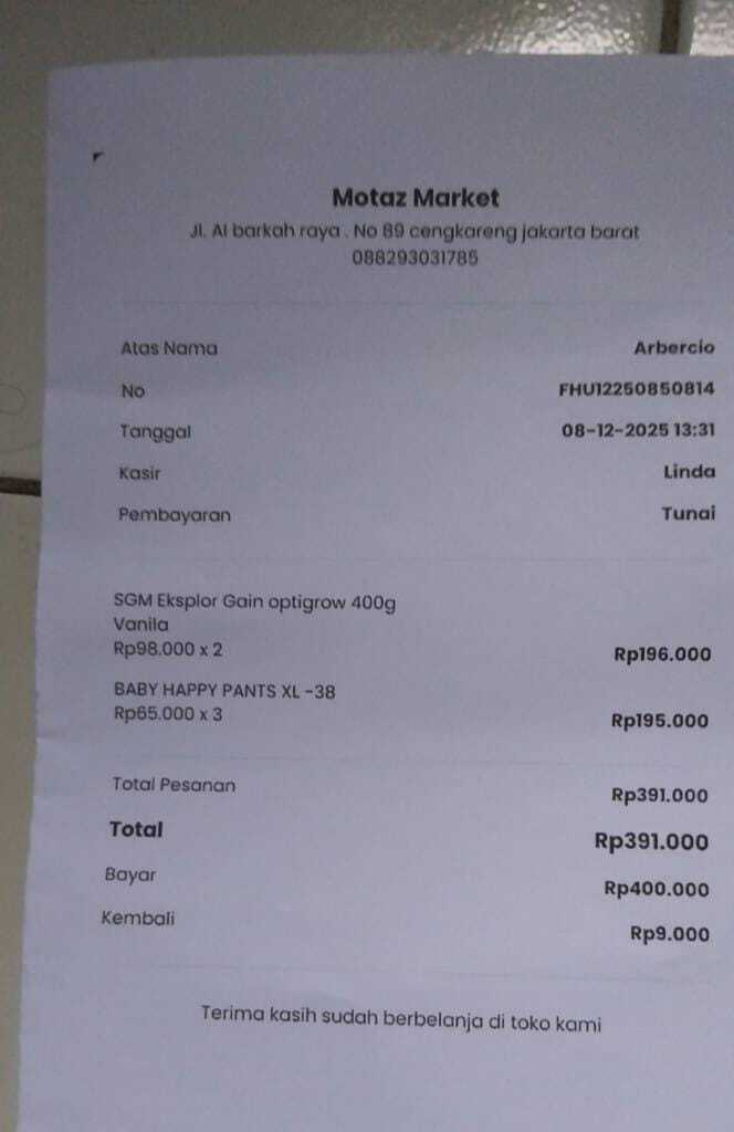 Dana digunakan untuk 1. Susu sgm 5 x Rp98.000= Rp490.000 2. Tisu basah 2 x Rp15.000=Rp30.000 3. Minyak telon Rp35.000 4. Baby happy 5 x Rp65.000= Rp325.000 5. Obat Valproic acid 5 x Rp65.000= Rp325.000 6. ObatLevetiracetam 3x Rp75.000= Rp225.0002026-01-27 14:02:16