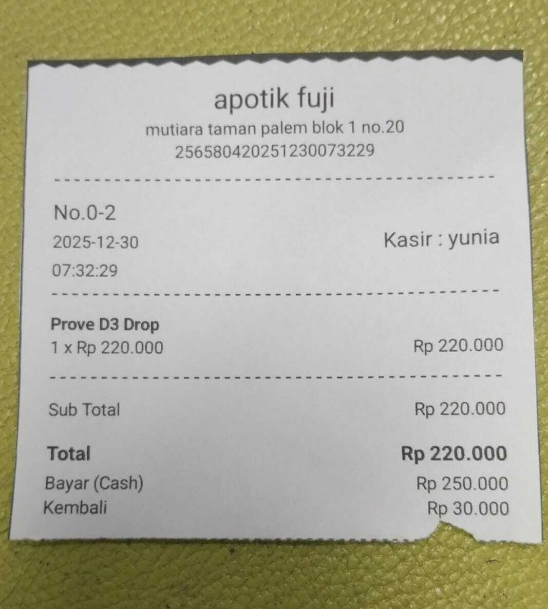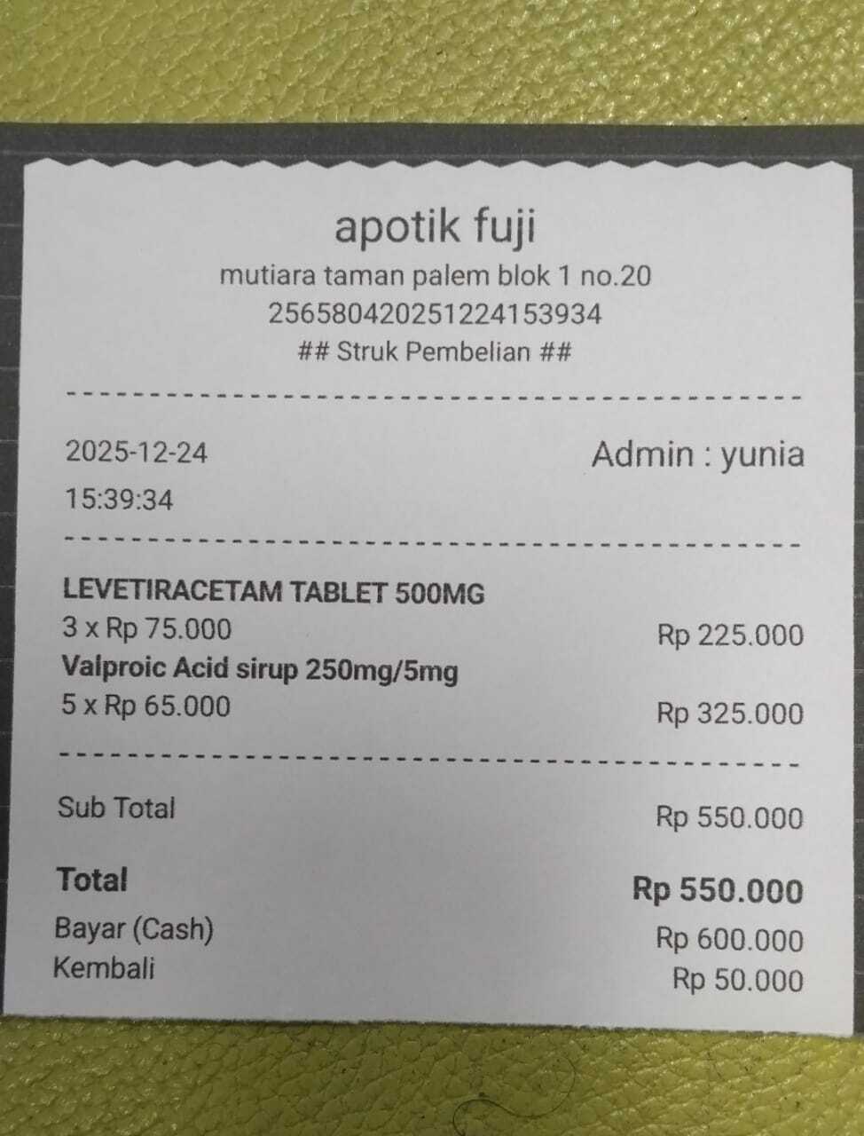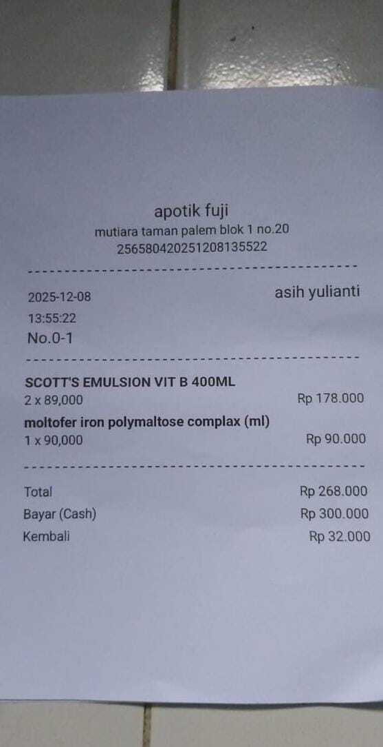 Dana digunakan untuk 1. Valproic acid 5 x Rp65.000 =Rp325.000 2.Pempers baby happy 5 x Rp65.000 = Rp325.000 3. Susu sgm optigrow 5 x Rp98.000= Rp490.000 4. Tisu basah 2 x Rp15.000= Rp30.000 5. Tisu kering Rp20.000 6. Minyak telon Rp35.000 7. Levetiracetam 3trip x Rp75.000 = Rp225.000 8. Trasnportasi online PP ke rs dari tanggal 19/12-31/12 Rp 225.000 9. Vitamin D3 prove D3 Rp220.0002025-12-24 10:41:33