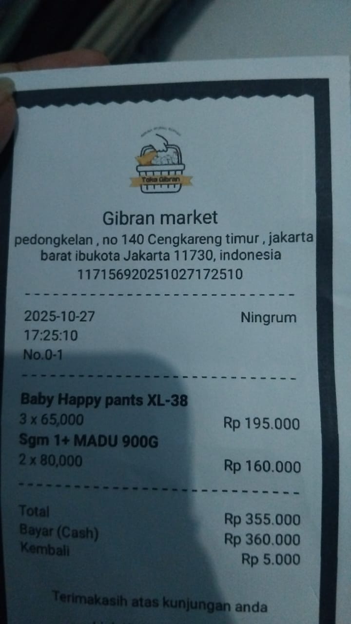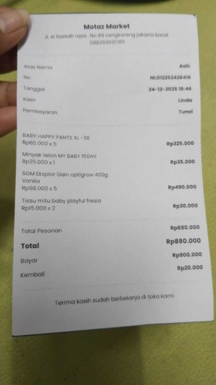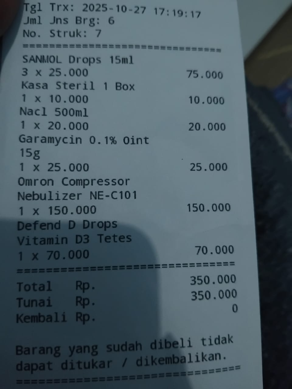 Dana digunakan untuk 1. Vitamin D3 tetes Rp70.000 2. Omicron nebulizer Rp150.000 3. Garamycin Rp25.000 4. Kasa 1 box Rp10.000 5. Nacl Rp20.000 6. Sanmol Rp25.000 7. Pampers baby happy Rp65.000 x 3= Rp195.000 8. Susu sgm 1+ Rp80.000 x 2 = Rp160.0002025-10-22 09:28:41